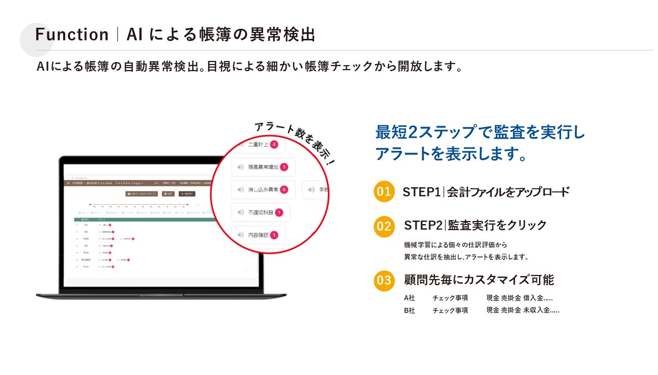 最短2ステップでチェックを実行し アラートを表示します。顧問先毎にチェック内容をカスタマイズ可能です。