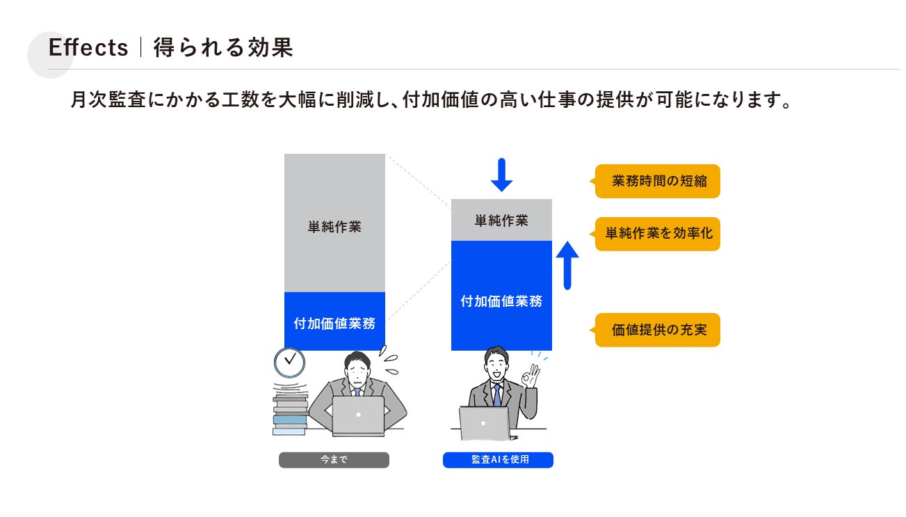 本サービスは一連の税理士の月次業務をAIを活用して税理士の定型・単純作業を自動化しています。1日がかりで帳簿のチェックやお客様への確認をしていたところを5分で実施することが可能です。