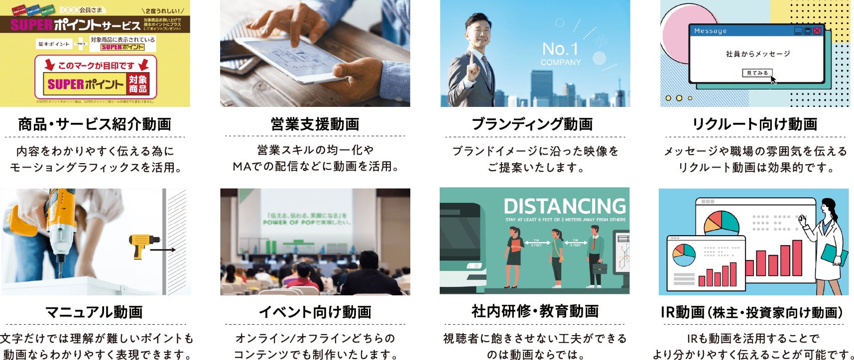 弊社が持つセールスプロモーションの知見を活かした企画設計力や運用体制を駆使し、動画を基軸としたプロモーションのご提案、各種印刷物の制作などをワンストップでサポートいたします!