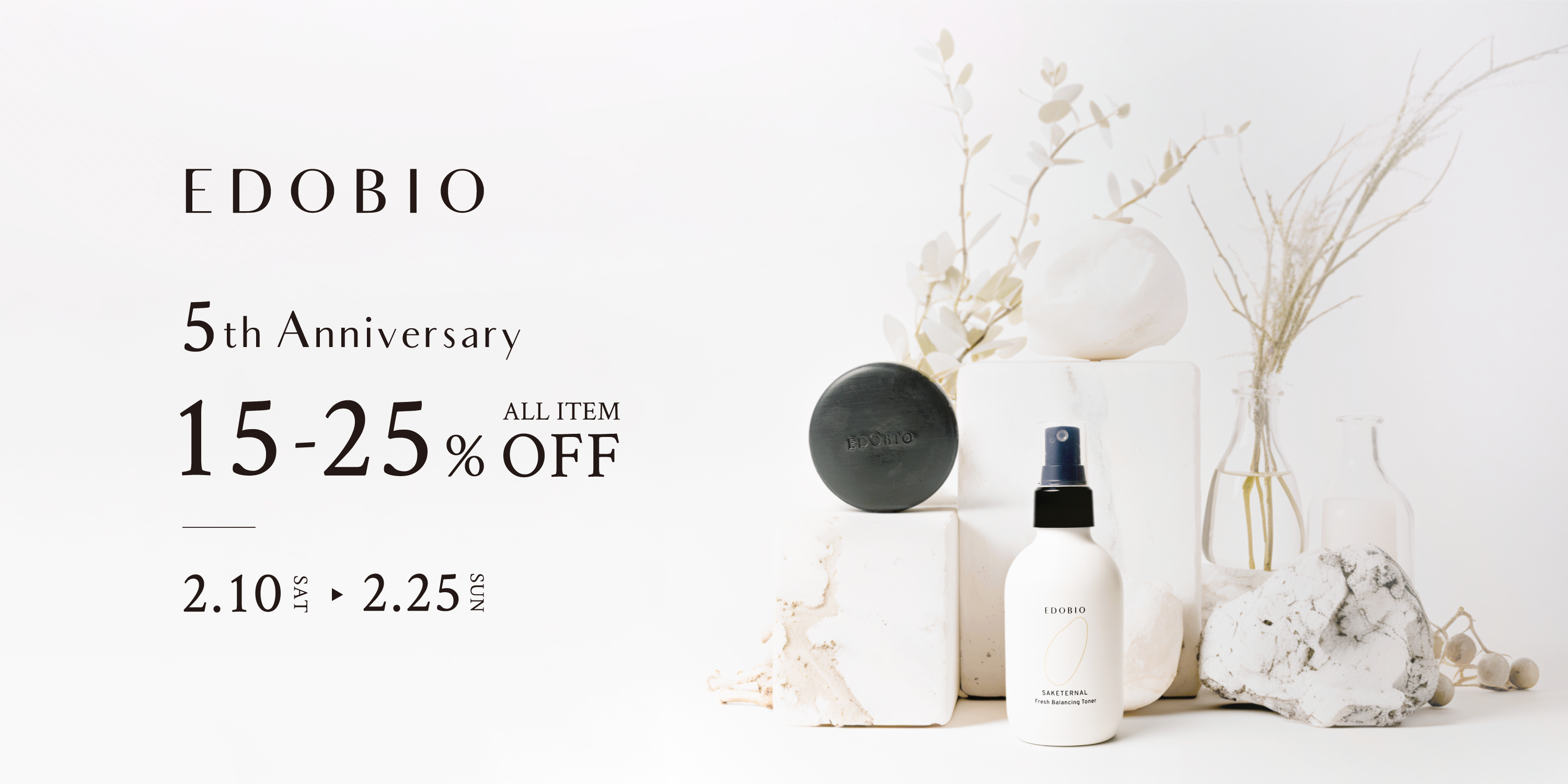 ブランドが5周年を迎えることを記念し、2024年2⽉10⽇(土)から2⽉25⽇(日)までの期間、全アイテムが15~25%OFFとなるEDOBIO最大級のセール『EDOBIO 5周年記念キャンペーン』を開催いたします。