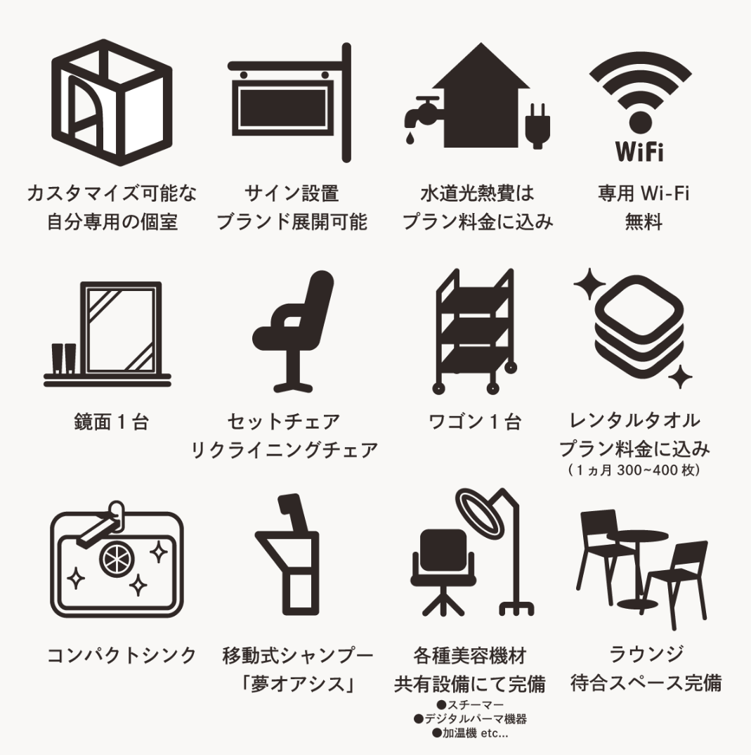 個人で専有できる完全個室空間を利用し『独立したフリーランス美容師のブランド化(独自のサロンブランド)』をあらゆる形で支援し、施設の提供だけではなく、ライフスタイルや働き方の変化等、多様性の拡大を想定した「ニューノーマル時代の顧客体験」をご提供中です。