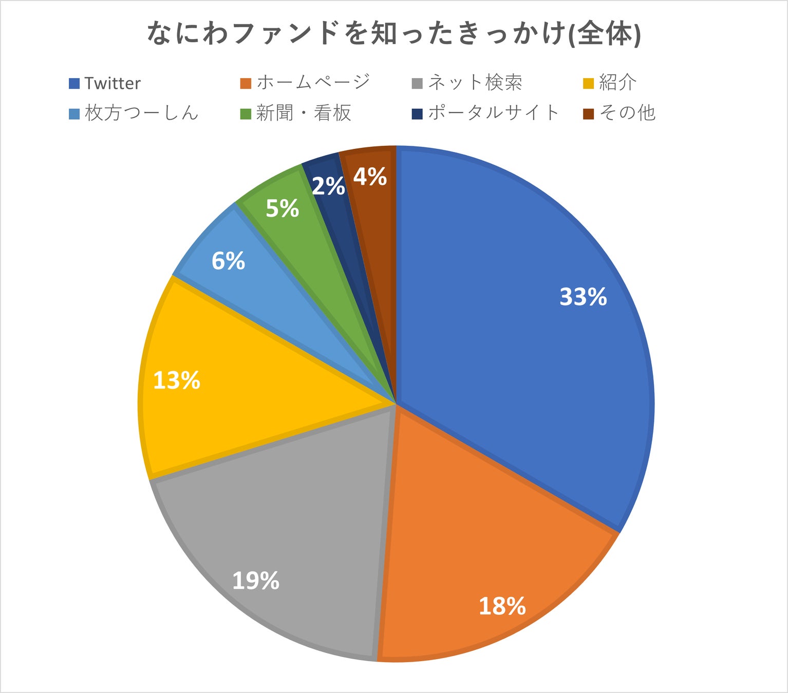 『おおきに8号』の出資申込書にご記入いただいたアンケートでも、なにわファンドを知ったきっかけについて、1位のTwitterが33%、2位のネット検索が21%、3位のHPが18%と、上位3位で7割以上を占める結果となっています。