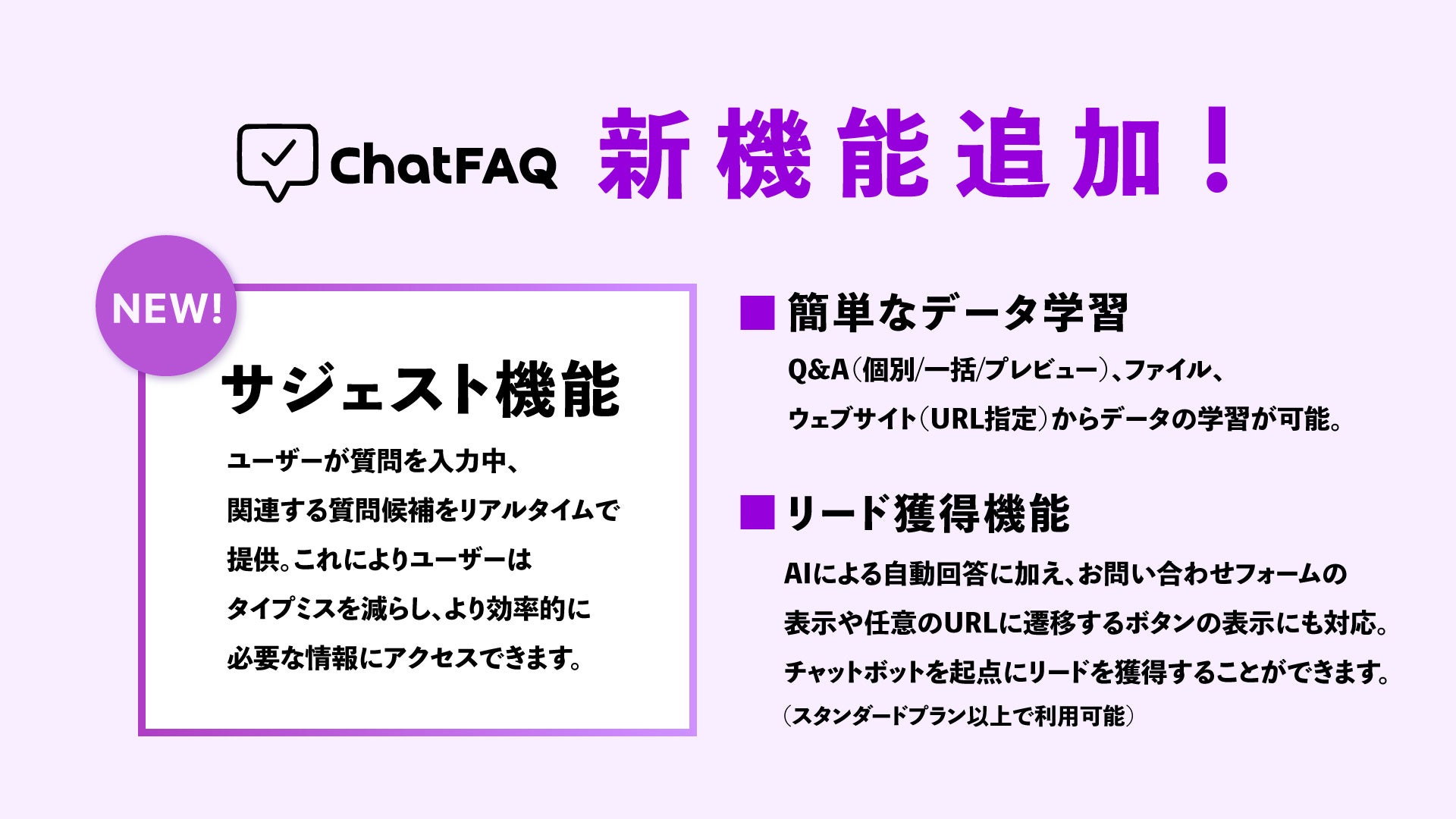 AIチャットボット作成サービス「Chat FAQ」(チャットエフエーキュー)、ユーザーフレンドリーな「サジェスト機能」を新たに追加