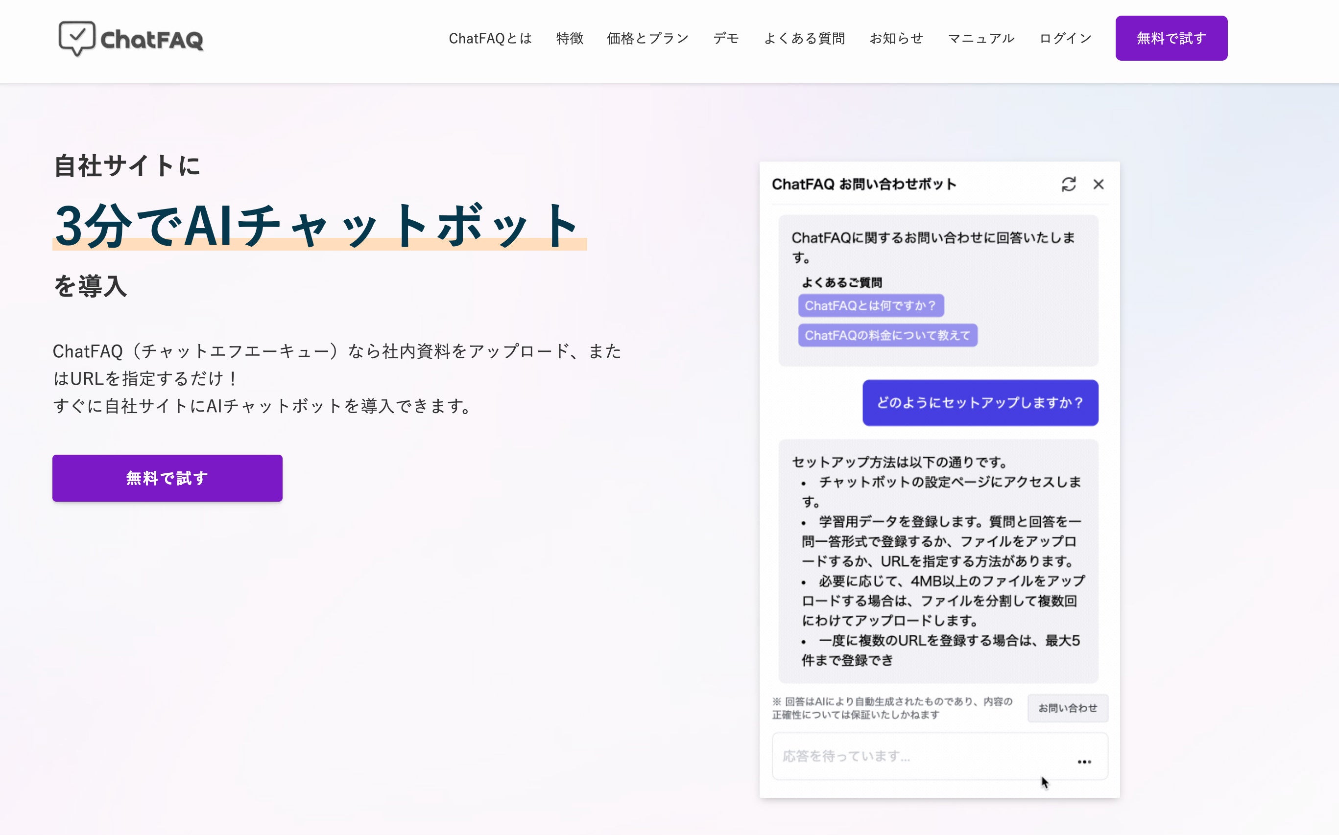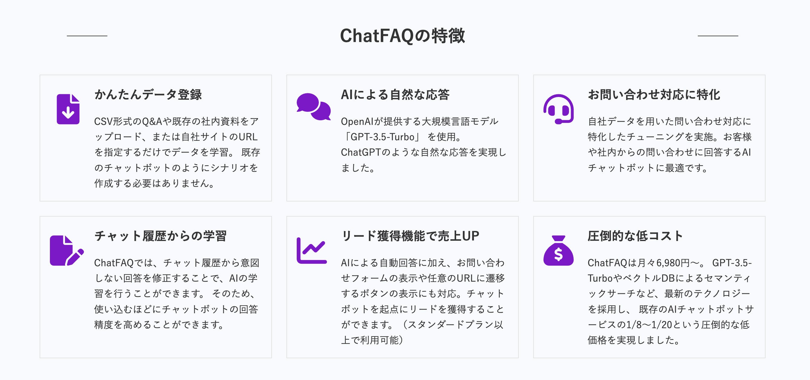 「Chat FAQ」はAIによる自然な回答を使い、リード獲得・売上UPに貢献するチャットボットサービスです。