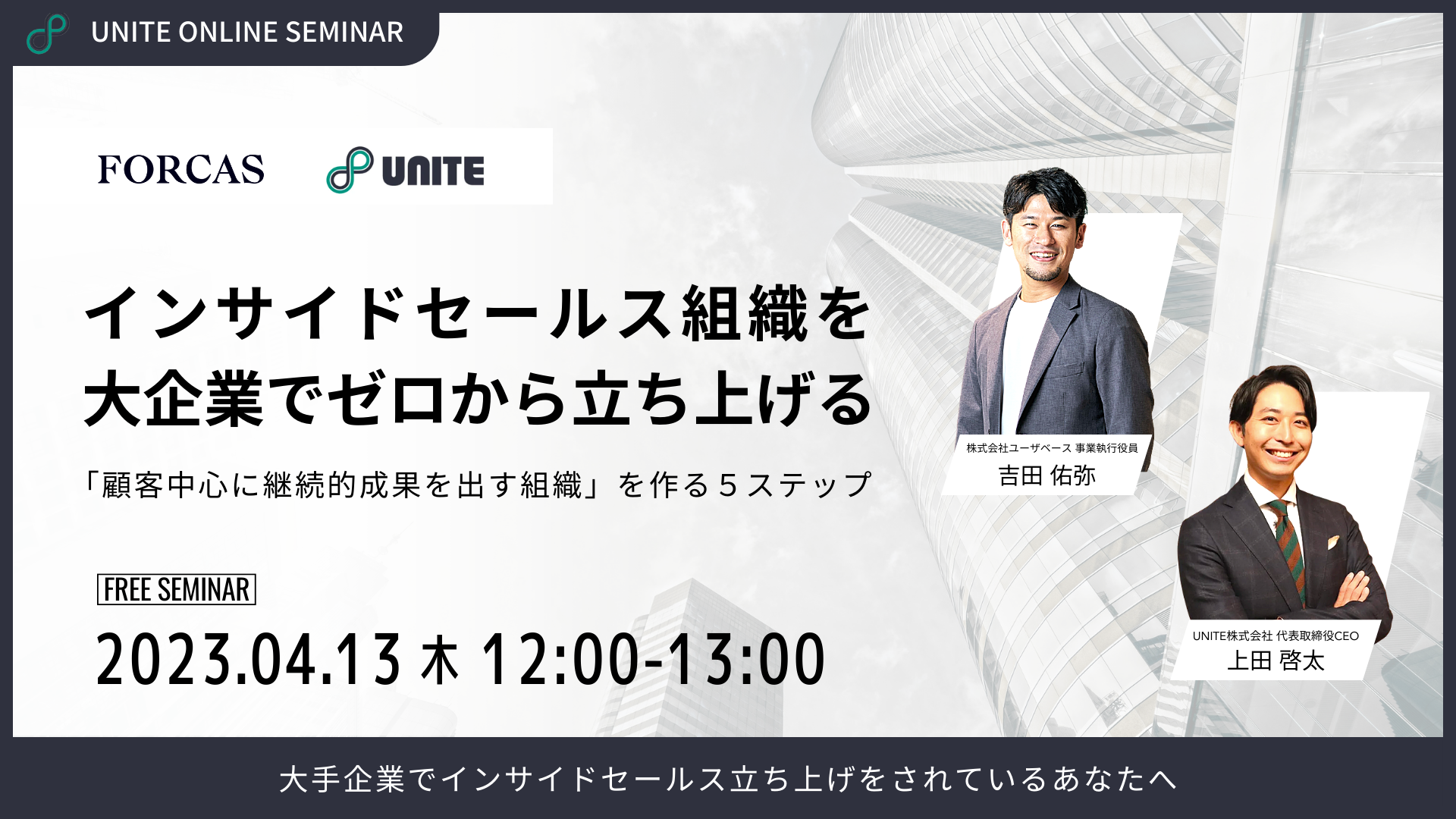 〈4月13日(木)無料ウェビナー開催〉【FORCAS×UNITE】大企業で0からインサイドセールス組織の立ち上げ時に踏む5ステップ