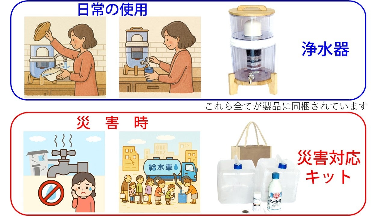 これにより、高価な業務用浄水装置を導入せずとも、災害時に現実的かつ実用的なウイルス対策を行える点が本製品の特長です。