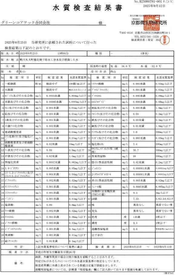 本製品は、京都市内を流れる鴨川の河川水を用いた水質検査において、環境省が定める水道水質基準51項目を全てクリアした実績を有しています。一般向けに販売されている浄水器では、業務用の高価格帯製品を除き、51項目全てを実水で検証・公表している例は極めて少なく、高い安全性を確認したモデルです。