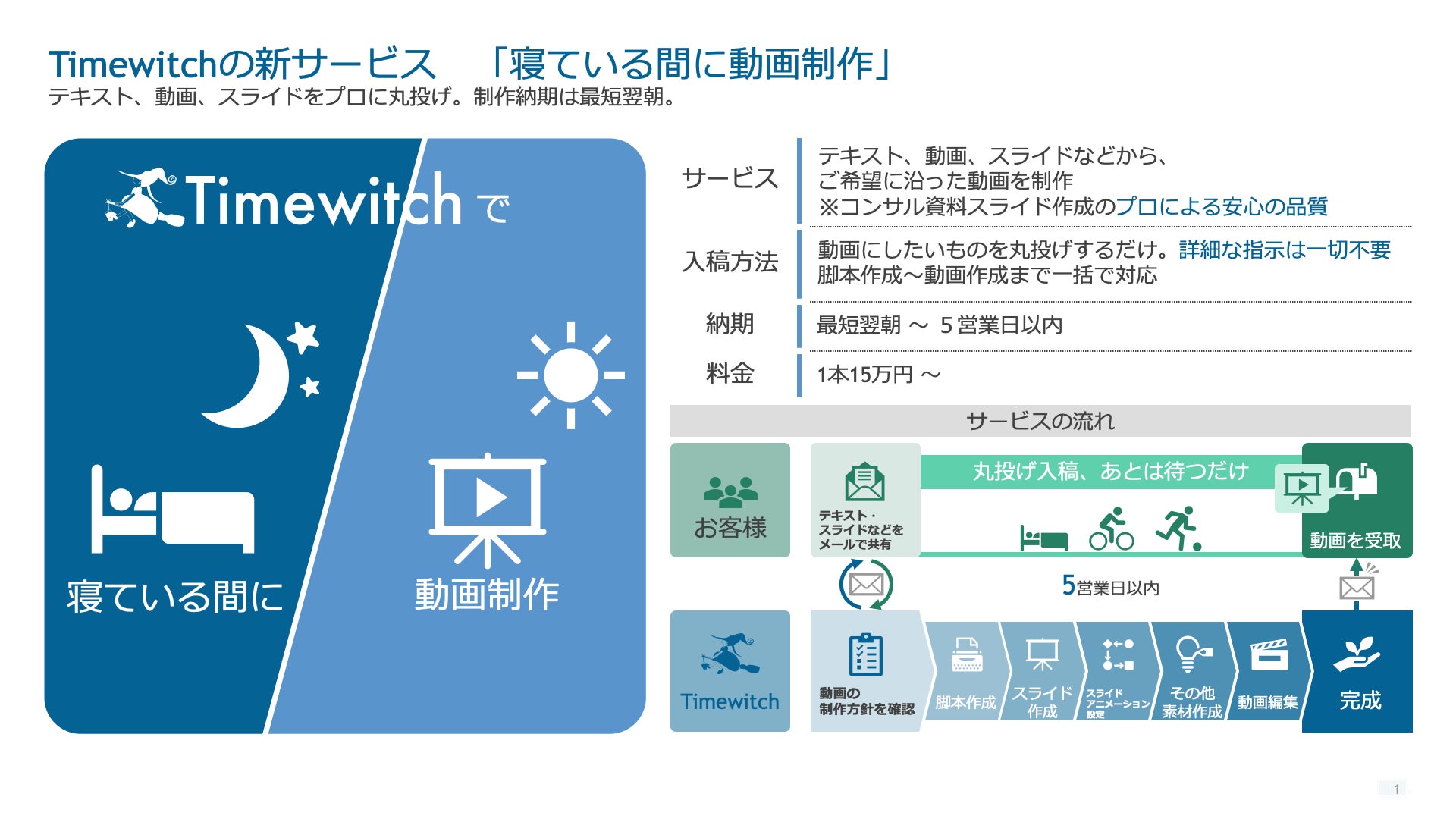 「寝ている間に資料作成」で、これまで2万枚以上のスライド資料を作成し日本の残業を減らしてきたTimewitchは、動画制作でも皆様の「睡眠」と「ビジネス」をサポートします。