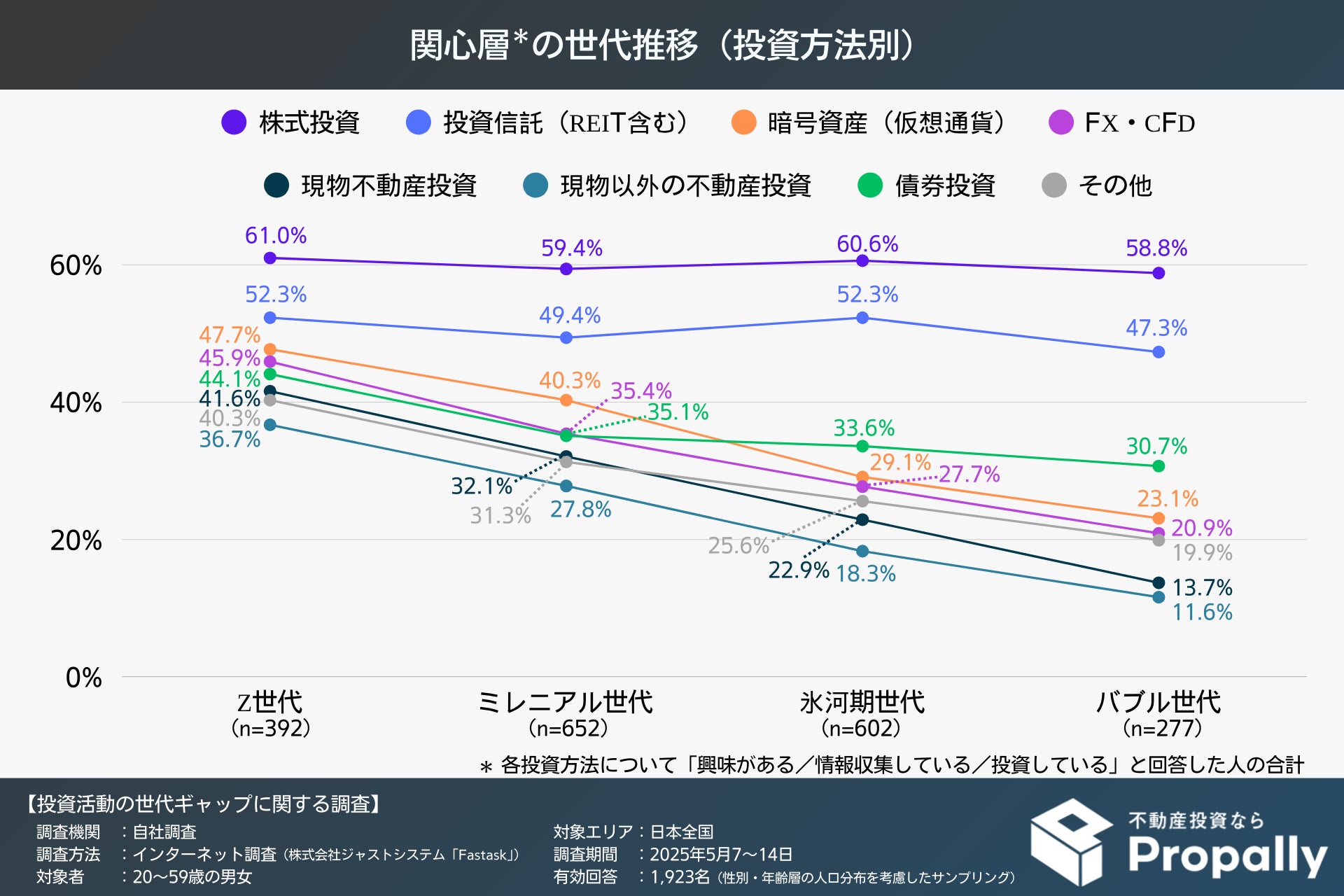 不動産投資プラットフォームの開発・運営を行うPropally株式会社( https://propally.co.jp/ )(本社:東京都港区、代表:齊藤郁織)は、世代による投資意識や行動の違いを明らかにするため、全国の20~59歳の男女1,923名を対象にアンケートを行いました。本調査では、若い世代ほど投資への関心や取り組みが多様化しており、世代間で投資に対する考え方に大きな違いがあることがわかりました。