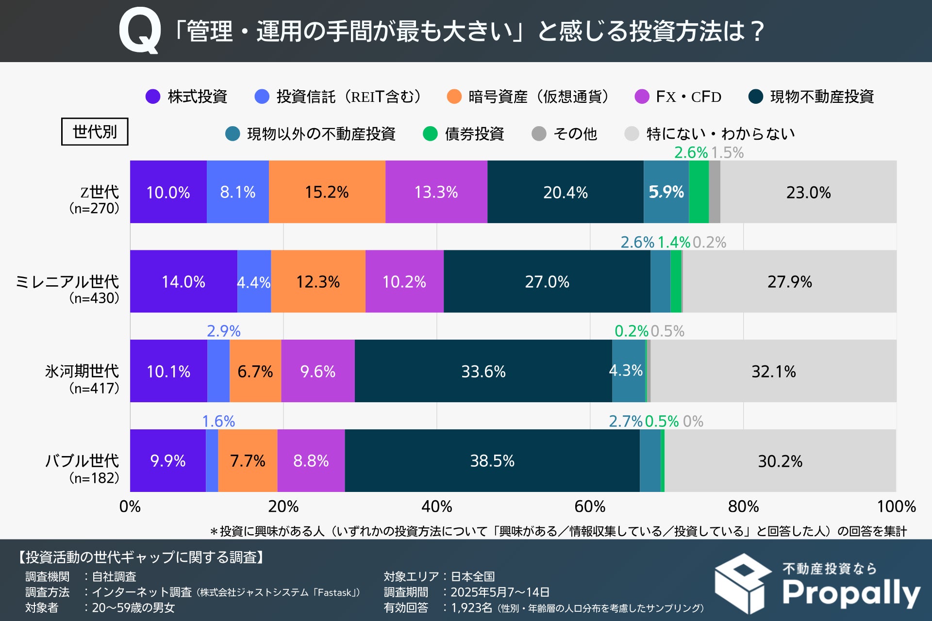 続いて、投資を始める上で最も管理・運用の手間が大きいと感じる投資方法について質問した結果を、世代別にまとめたグラフです。