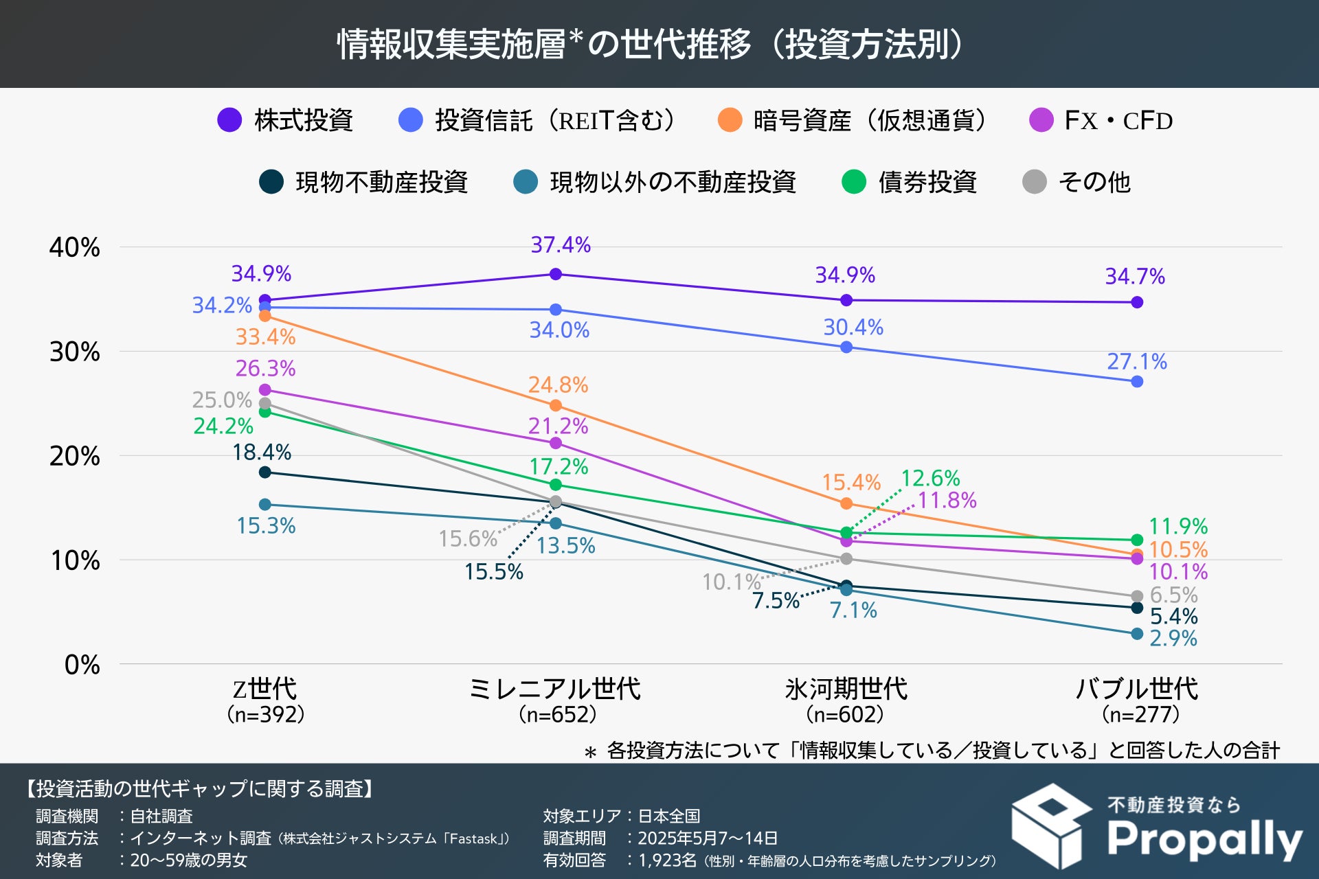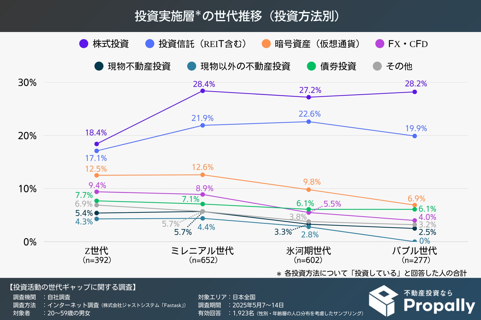 2.Z世代の投資実施率は株式18.4%、暗号資産12.5%、現物不動産5.4%、多様な投資に分散傾向