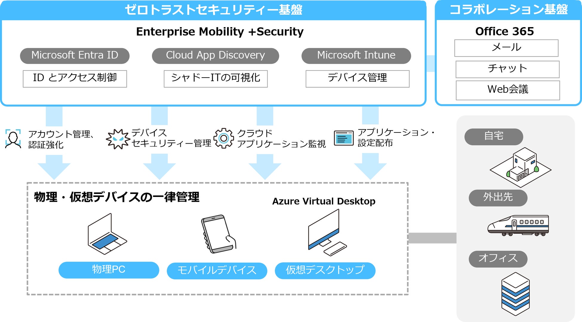 BIPROGY グループは、サイバーセキュリティー対策で作り上げてきたMicrosoft 365環境を最大限活用し、シンクライアントのAVDを加えてEnterprise Mobility +Securityで統合管理することで、より先進的な運用環境を実現します。
