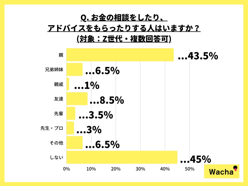 【Wacha調査レポート】お金の相談相手は親が43.5%、相談しないが45%!