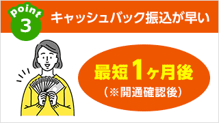 キャッシュバックが早い!なんと最短1ヶ月後には、指定の口座へ現金をお振込致します。当社が選ばれる大きな理由の1つです。