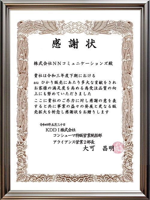 NEW! 【14期連続表彰】KDDIより感謝状を受賞