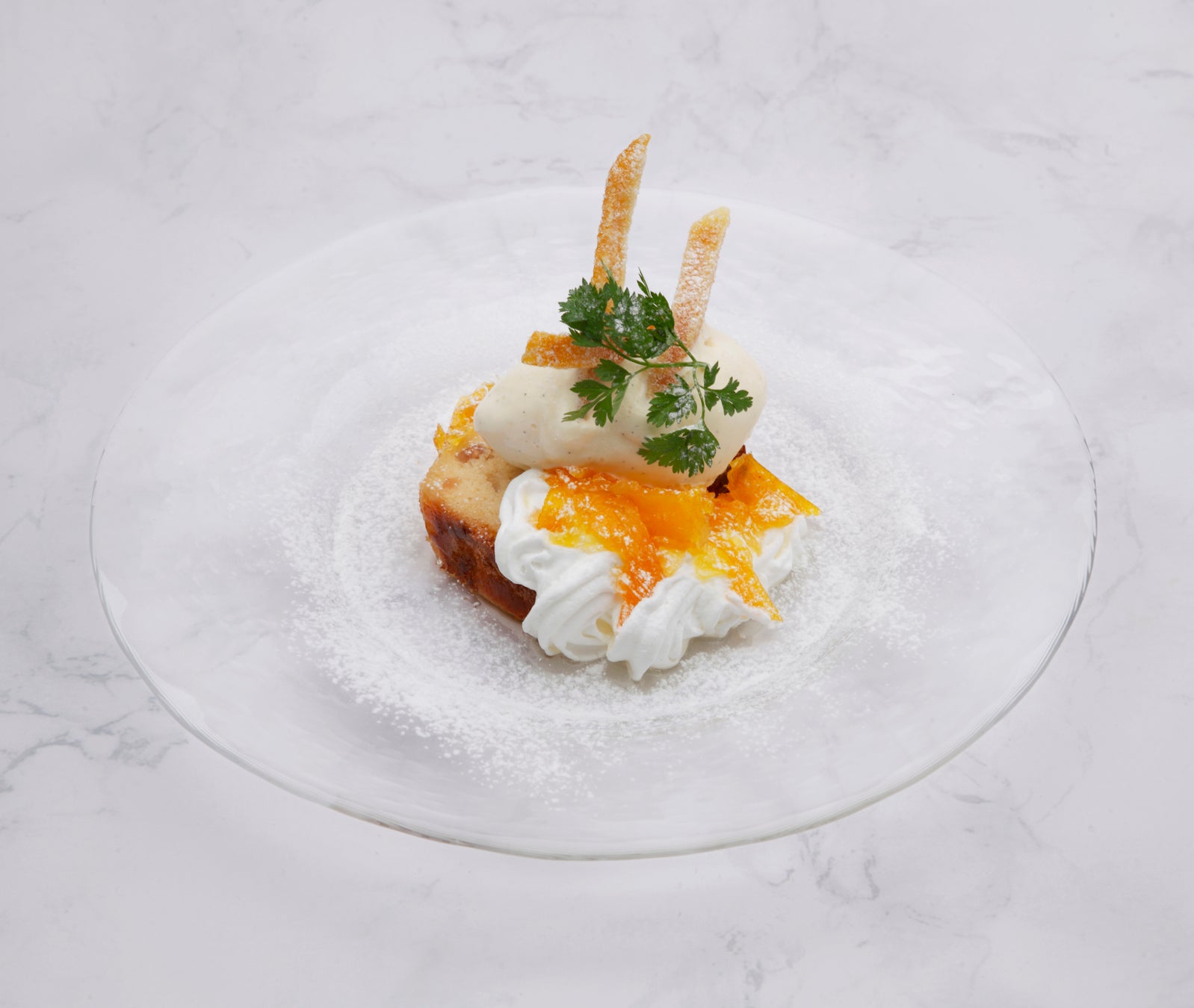 マスカルポーネと生クリームのムースに、みずみずしいはっさくの果肉とはっさくを使用したカラメルソースを合わせました。