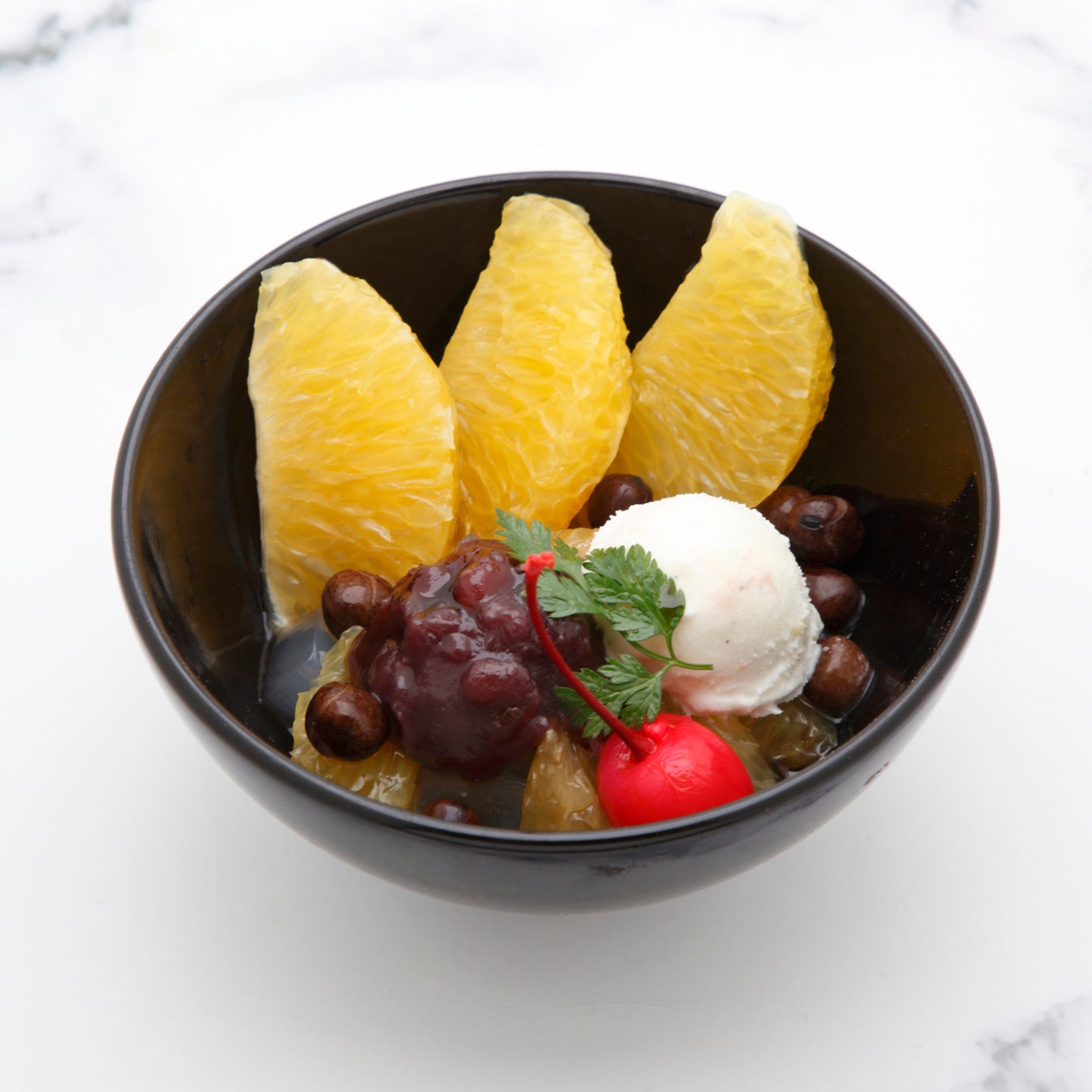 紀の川市のはっさくをたっぷり使ったクリームあんみつ。