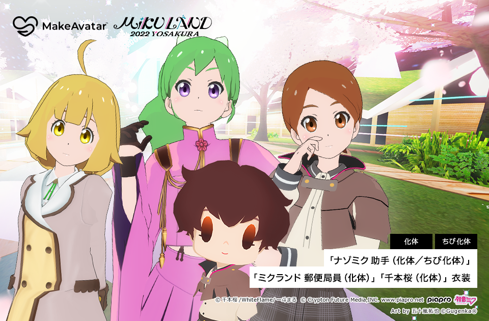 初音ミク公式VRワールド『MIKU LAND 2022 YOSAKURA』のそれぞれのワールドをイメージした3DCGアバター衣装です。自分のアバターに衣装を着せてVR空間に遊びに行くことができます。