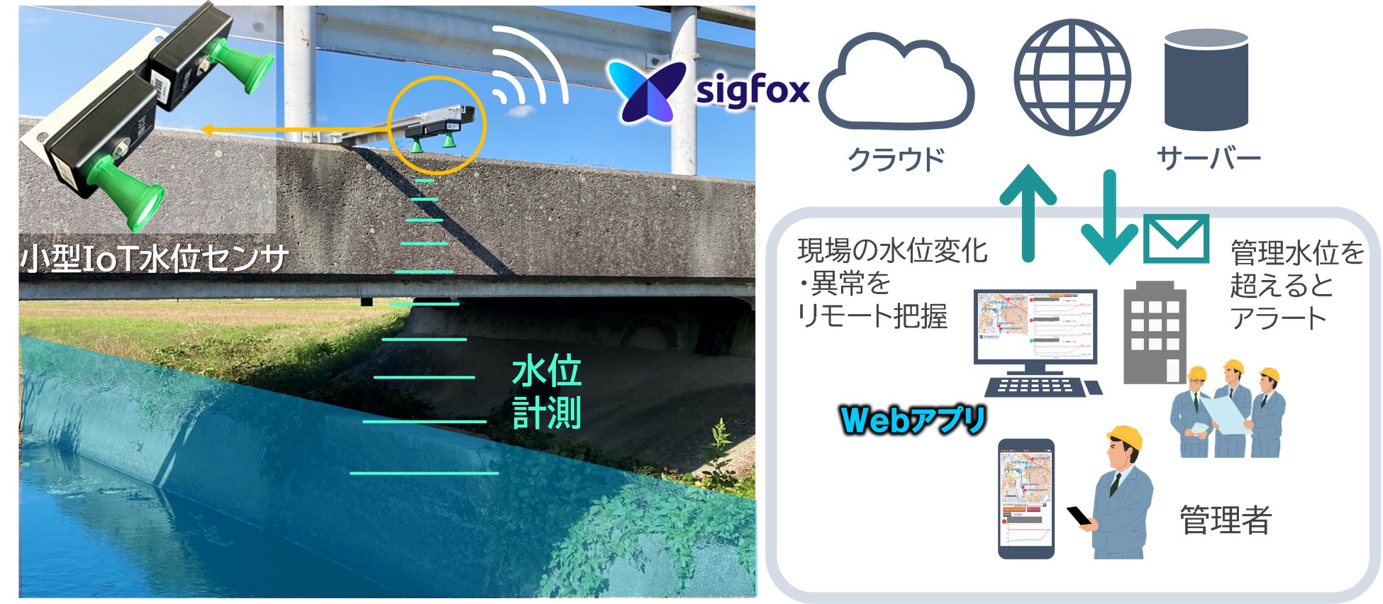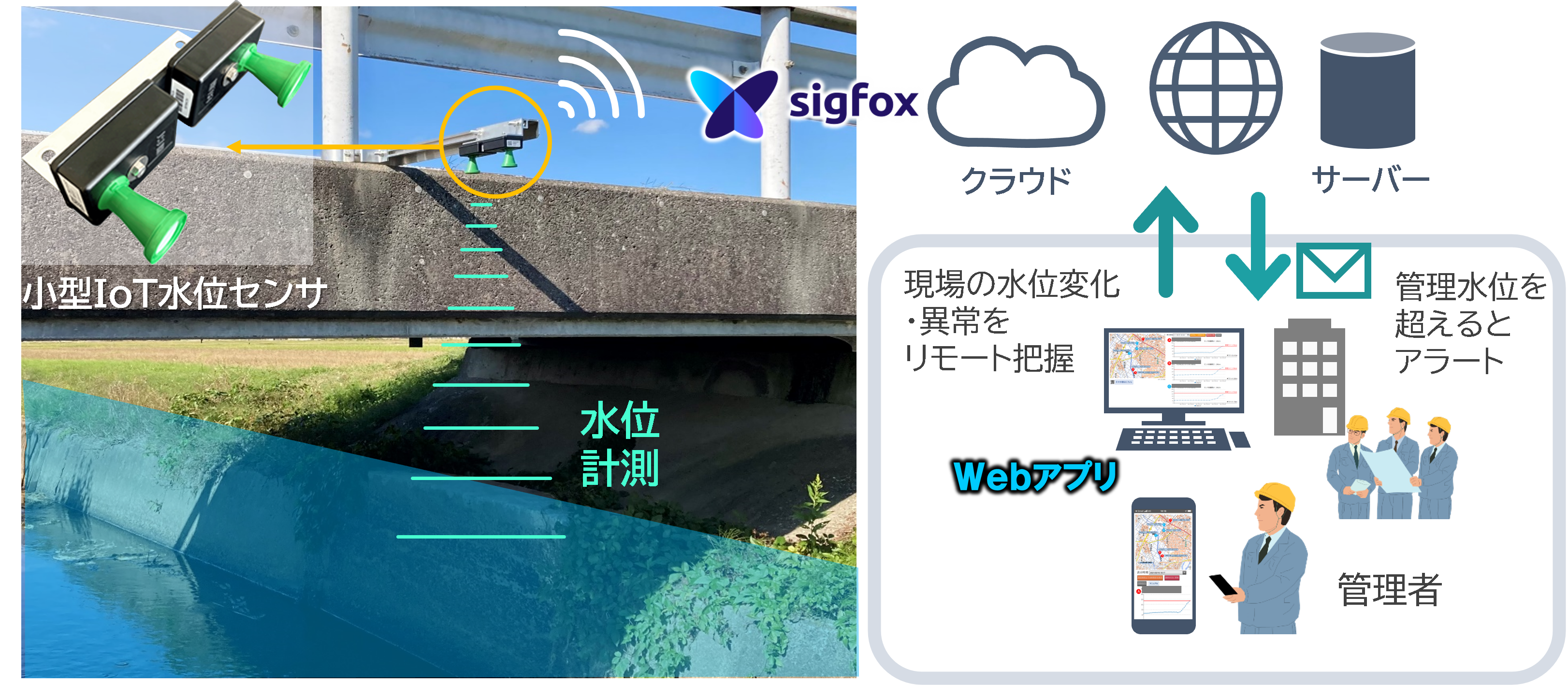 当社は既に河川の⽔位監視ができる⼩型・軽量なIoT ⽔位センサを開発しており、現場の⽔位変化・異常をリモートで把握