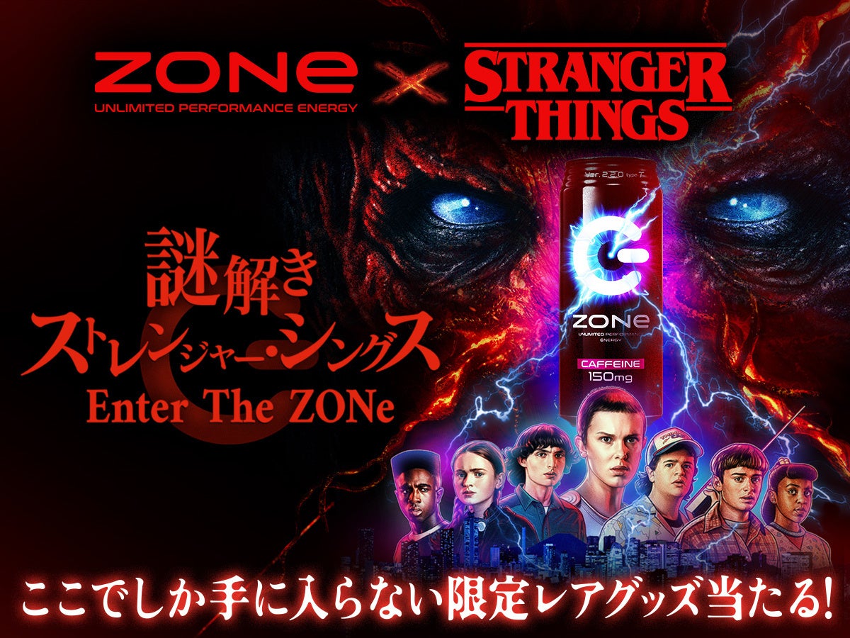 アンリミテッドパフォーマンスエナジー「ZONe(ゾーン)」は2022年7月5日(火)、Netflixシリーズ「ストレンジャー・シングス 未知の世界」(以下ストレンジャー・シングス)とのコラボレーションによるオリジナル謎解きコンテンツ「謎解きストレンジャー・シングス Enter The ZONe」を公開し、ゲームに連動したプレゼントキャンペーンとTwitterキャンペーンを同時開催いたします。