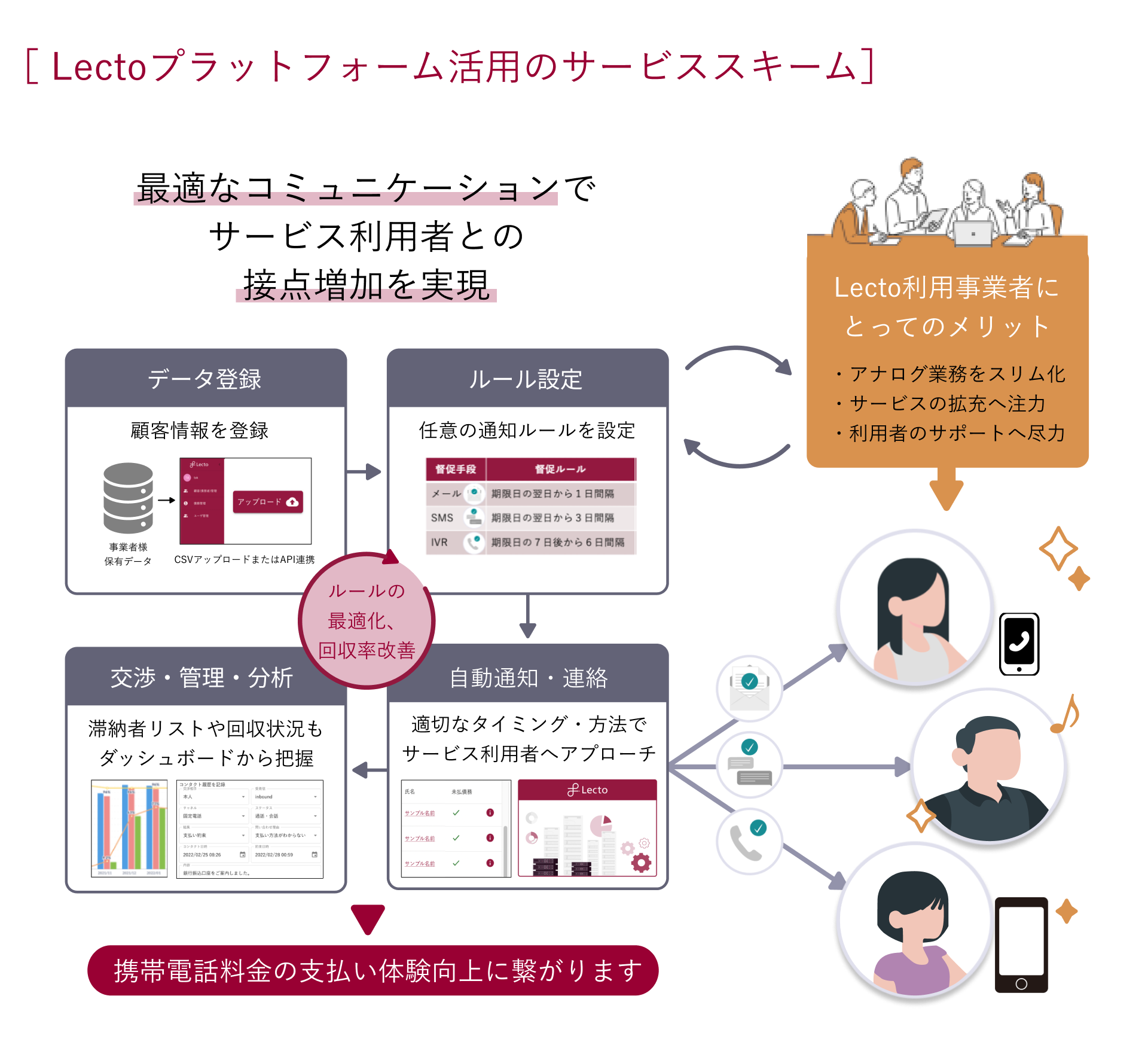 債権管理業務のDXを推進しているLecto株式会社(本社:東京都渋谷区、代表取締役社長:小山 裕、以下 「Lecto」「当社」)は、だれでもモバイル株式会社(本社:東京都台東区、取締役社長:湖尻純、以下「だれでもモバイル」)と契約を締結し、Lecto独自のテクノロジーを活用した債権管理サービス「Lectoプラットフォーム」のご利用を開始いただいたことをご報告いたします。Lectoはだれでもモバイルが提供している格安スマホなどのMVNO事業における、顧客管理・支払いリマインド業務を効率化させることを通じて、ご利用ユーザーのコミュニケーション体験の向上をサポートし、「全ての人に再挑戦ができる世界を作りたい」というだれでもモバイル社の想いに貢献いたします。