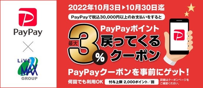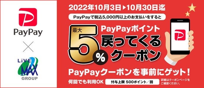 事前に「PayPay」アプリでリブマックス ホテルズ&リゾーツのクーポン2種類を取得し、お支払いでお使いいただいた場合、税込5,000円以上のお支払いで決済金額の最大5%(付与上限500ポイント/回)がPayPayポイントとして付与されます。なお、税込30,000円以上のお支払いは決済金額の最大3%(付与上限2,000ポイント/回)がPayPayポイントとして付与されます。