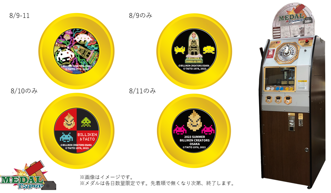 株式会社タイトーのご協賛により、同社が1978年に開発・発売し世界的に大ブームを巻き起こしたシューティングゲーム『スペースインベーダー』とビリケンさんの特別コラボデザインのメダルタイパーを設置いたします。