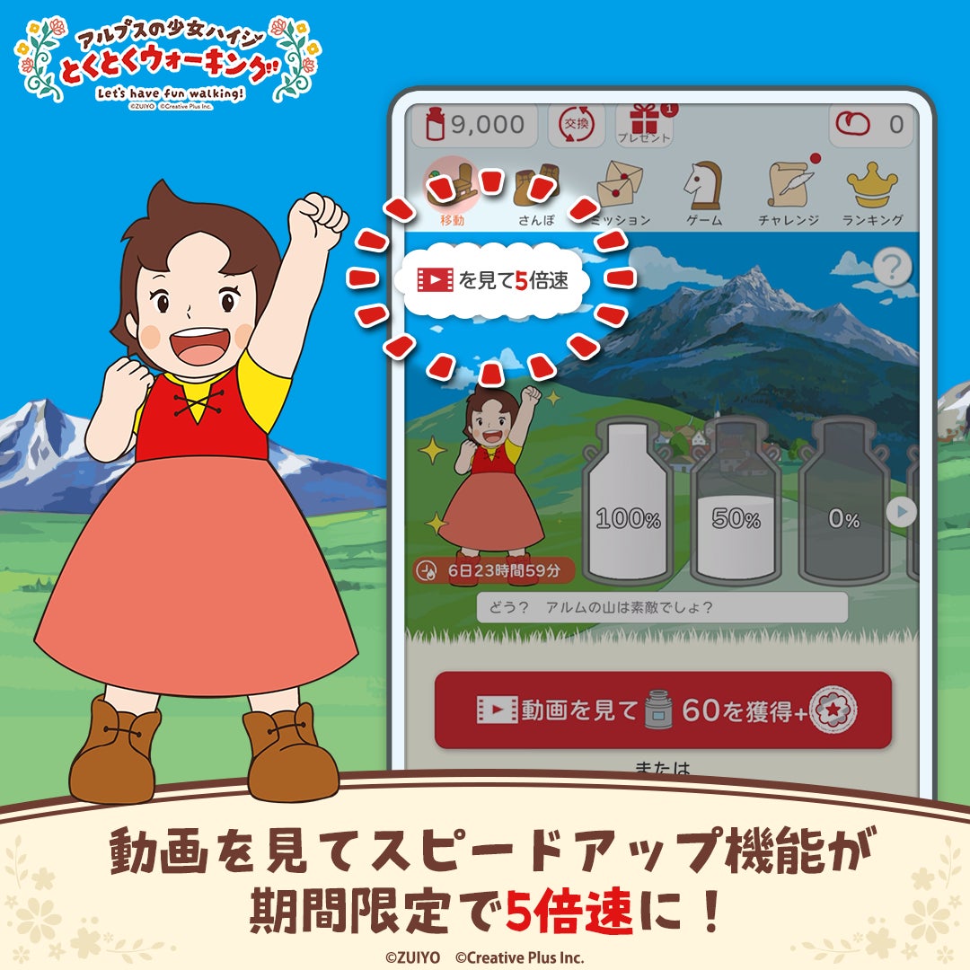 株式会社エムアップホールディングス(所在地:東京都渋谷区、代表取締役:美藤 宏一郎)の連結子会社であり、キャラクターやアニメIPを活用したコンテンツ配信やコラボ実施を手掛ける株式会社 Creative Plus(所在地:東京都渋谷区、代表取締役:加藤 周太郎)は、今年放映50周年を迎えた『アルプスの少女ハイジ(以下、「ハイジ」)』のポイ活アプリ『アルプスの少女ハイジ とくとくウォーキング』(以下、本アプリ)において、「お正月キャンペーン」ならびに「おトクな年末年始キャンペーン」を開始しましたので、下記の通りお知らせいたします。