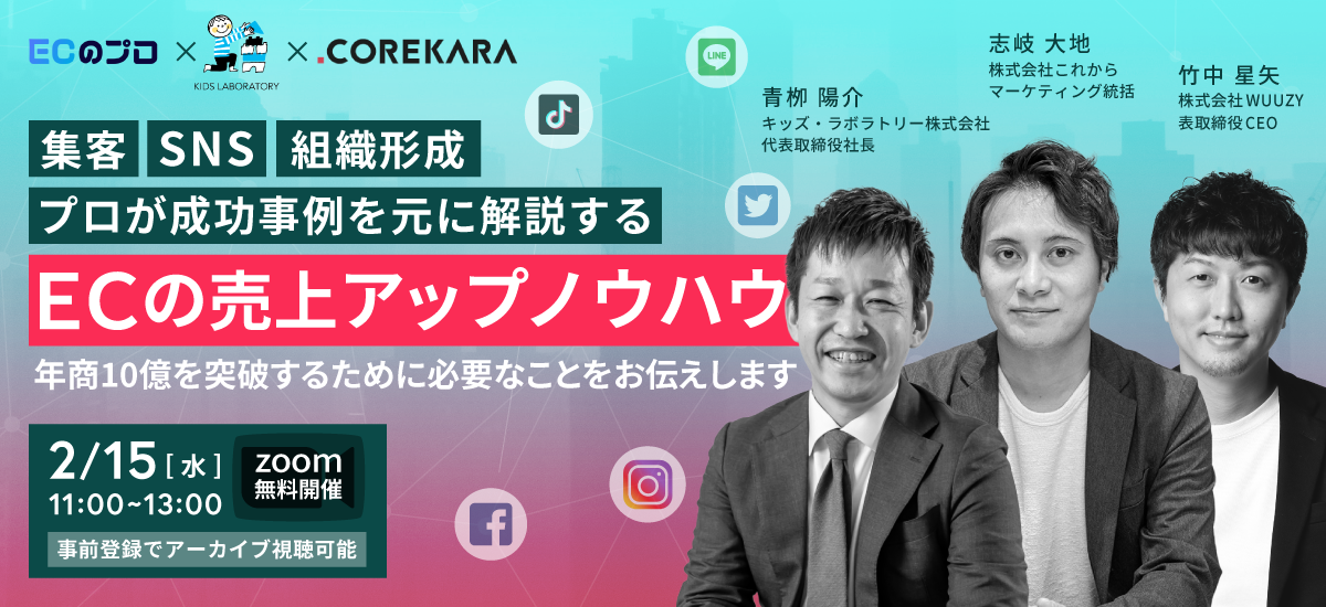 【2月15日(水) 11:00】無料ウェビナー『集客・SNS運用・組織形成のプロが成功事例を元に解説するECの売上アップノウハウ』を開催
