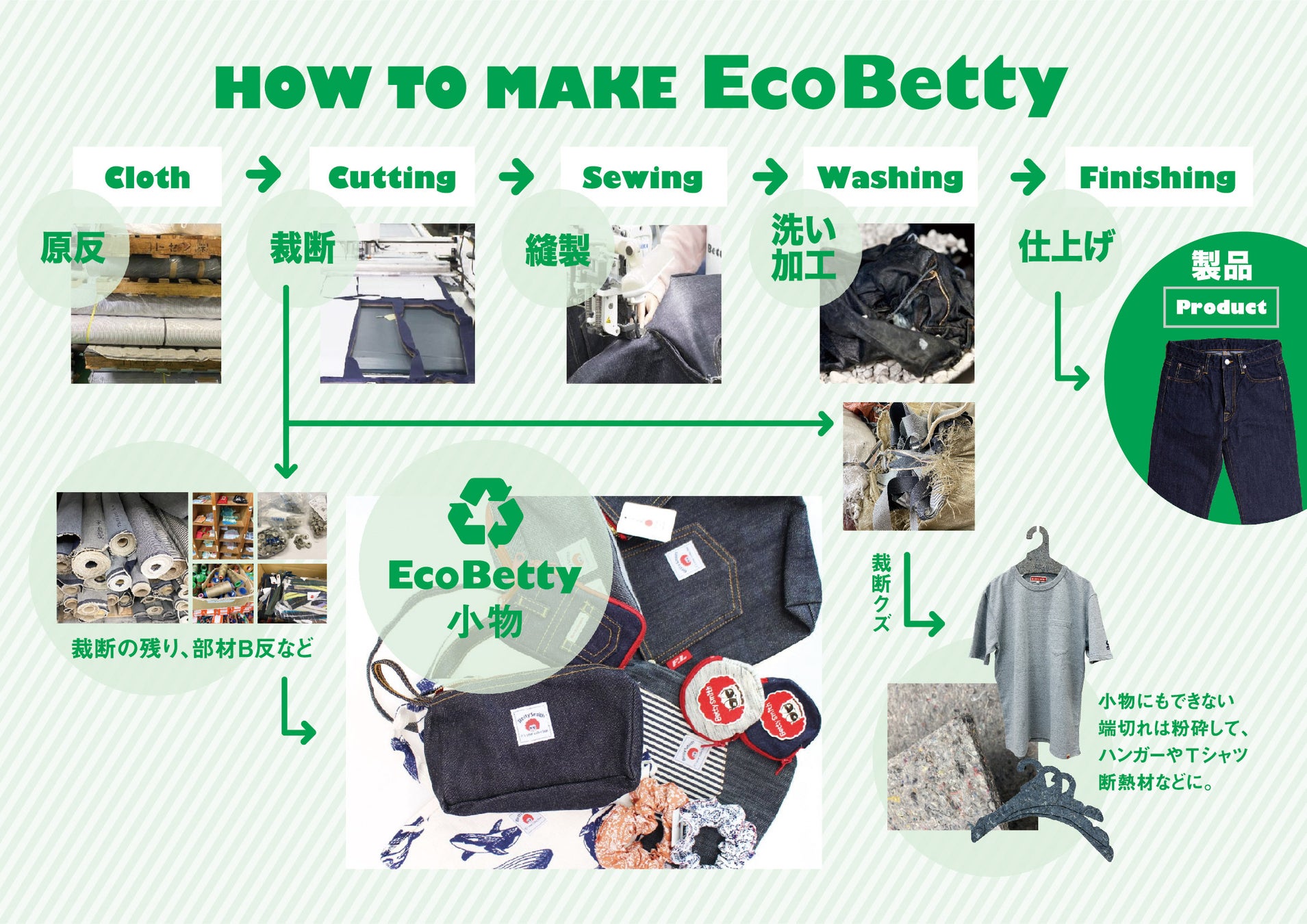 2003年に端切れを活用した小物ブランド「エコベティ」をスタート。在庫を持たないオーダージーンズ®や、廃棄製品をアップサイクルするデニムリボーン®など、20年以上にわたり、環境配慮へ取り組んできました。