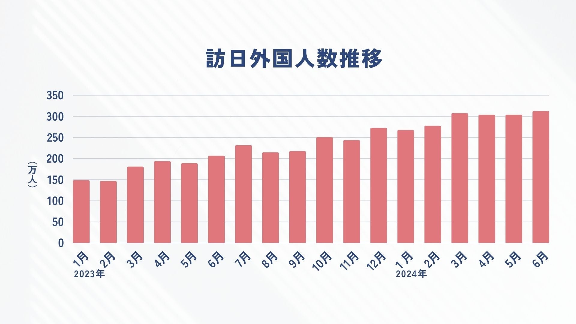 全国各地で訪日外国人観光客が増加する中、2024年6月の訪日外国人数は313万人に達し、単月で過去最高を記録しました。この増加傾向は、今後も続くと予想されています。