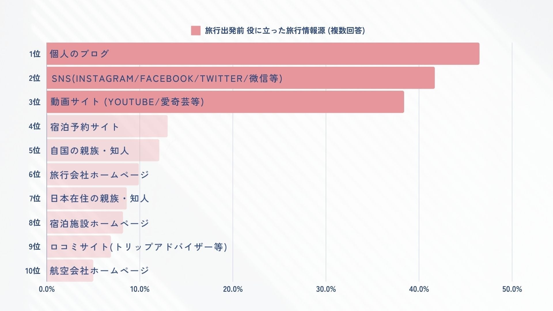 インバウンド観光客の情報収集手段として、昨今ではSNSが主要なツールとなっています。SNSを通じて観光地やアクティビティの情報を得て訪れる場所を決めることが増えており、その影響力は年々非常に大きくなっています。