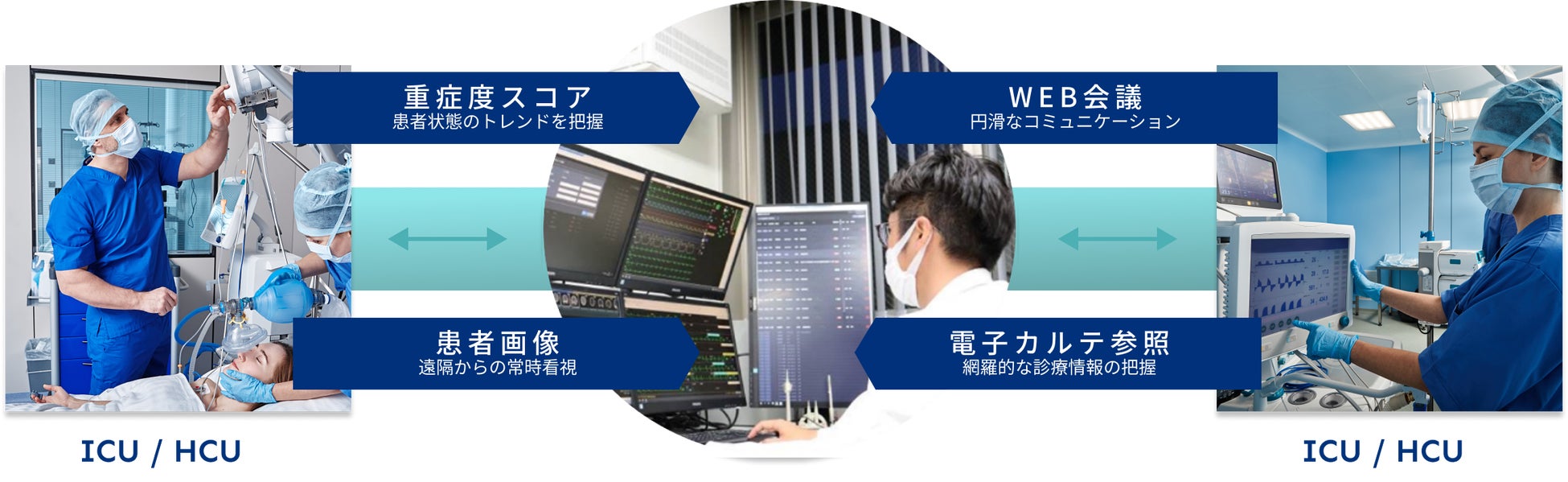 遠隔ICUとは、複数のICU(集中治療室)をネットワークでつなぐことで、遠隔での診療支援を実現する治療モデルです。