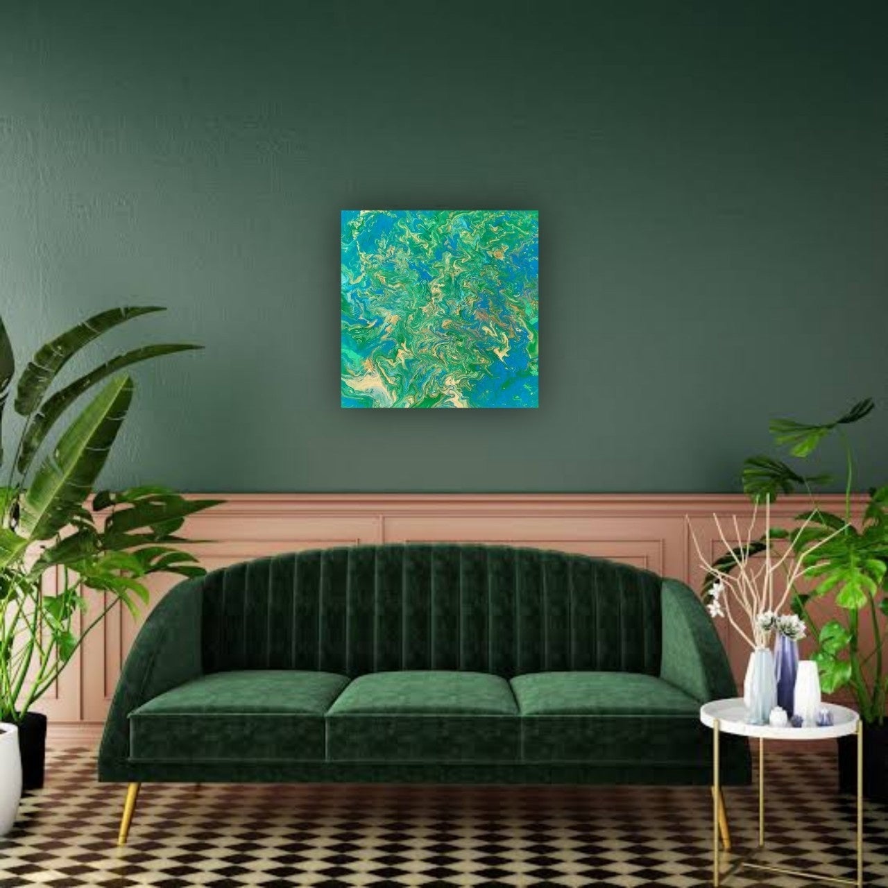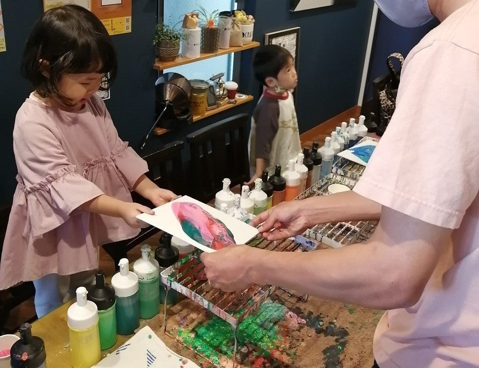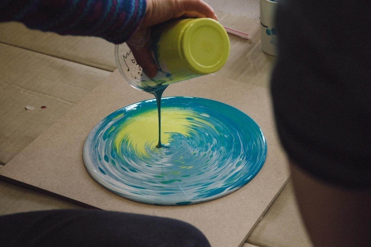数種類のアクリル絵の具をキャンバスに垂らし、流動性を生かして描く技法。キャンバスを傾けたり、手で絵の具を広げたりして、作品を仕上げます。色同士が混ざり合わないため、美しいマーブル模様が出来上がります。