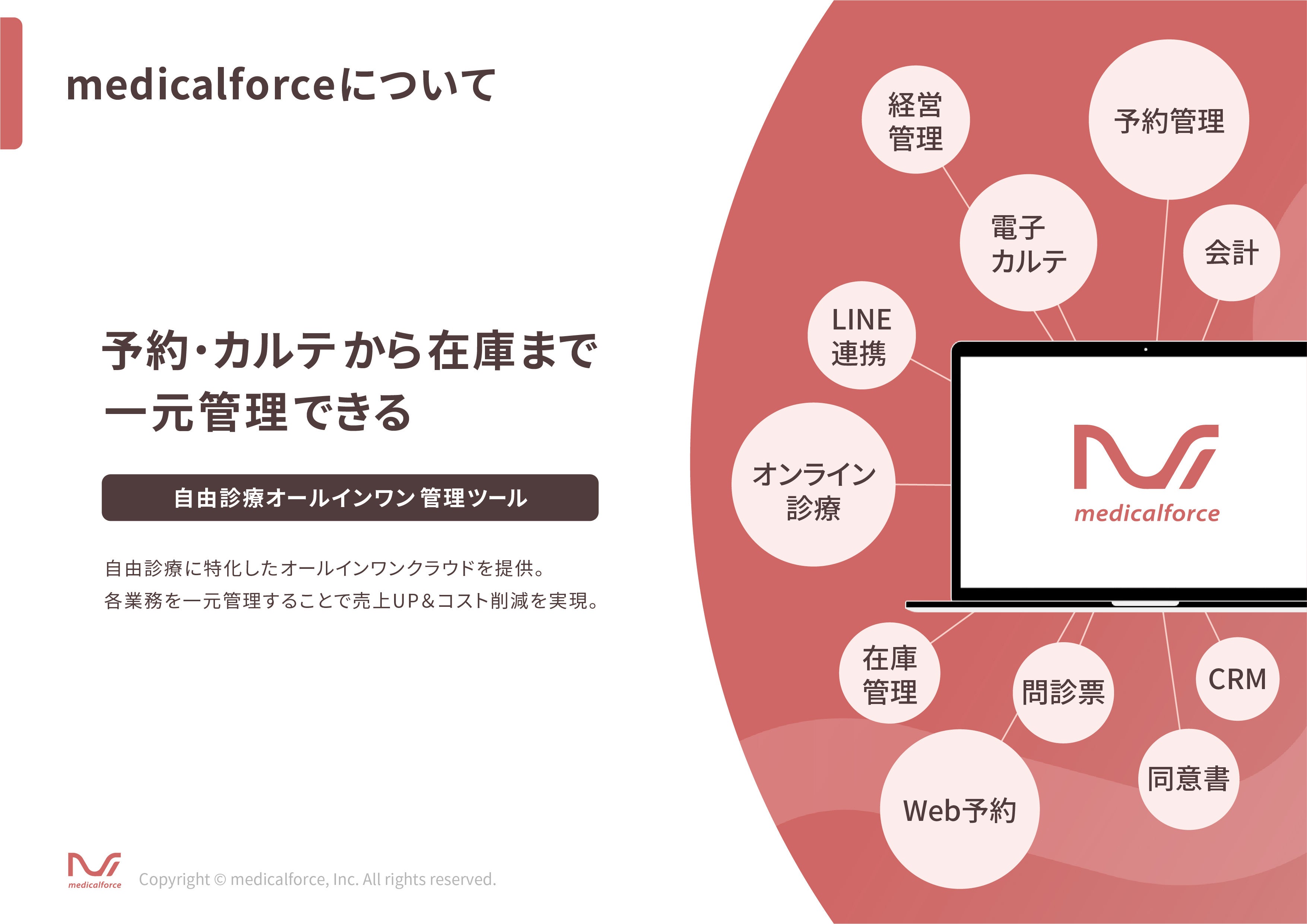 『medicalforce』は美容クリニック・自由診療の現場業務を1つのシステムで管理・連携を可能にするオールインワンSaaSです。診療の予約や問診、電子カルテなどの日常業務に加えて顧客情報管理(CRM)の機能も備え、対話アプリケーション「LINE」との連携など、患者様の利便性を高める機能も追加が可能です。