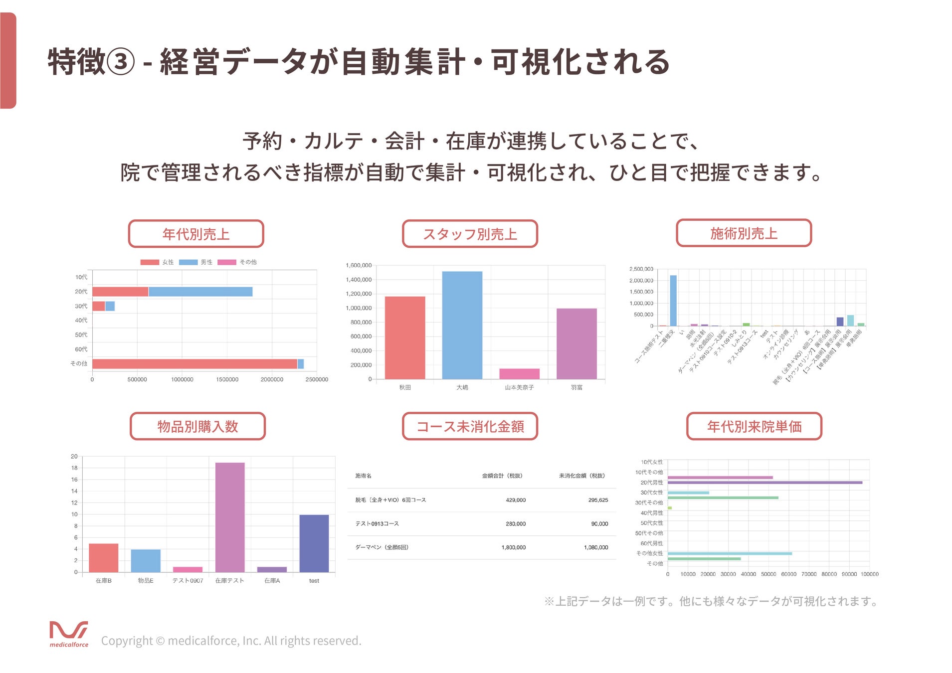従来、美容クリニックでは機能ごとに異なるツールやシステムを利用していたため、業務のミスが起きやすい環境下にありました。『medicalforce』は複数の機能を一つに統合することで業務のミスを少なくしつつ、患者様の顧客体験を高めることができます。また、クリニック業務の円滑化だけをゴールとせず、経営管理のダッシュボードやCRM機能で、集客強化なども含めたクリニック運営全体のサポートをいたします。