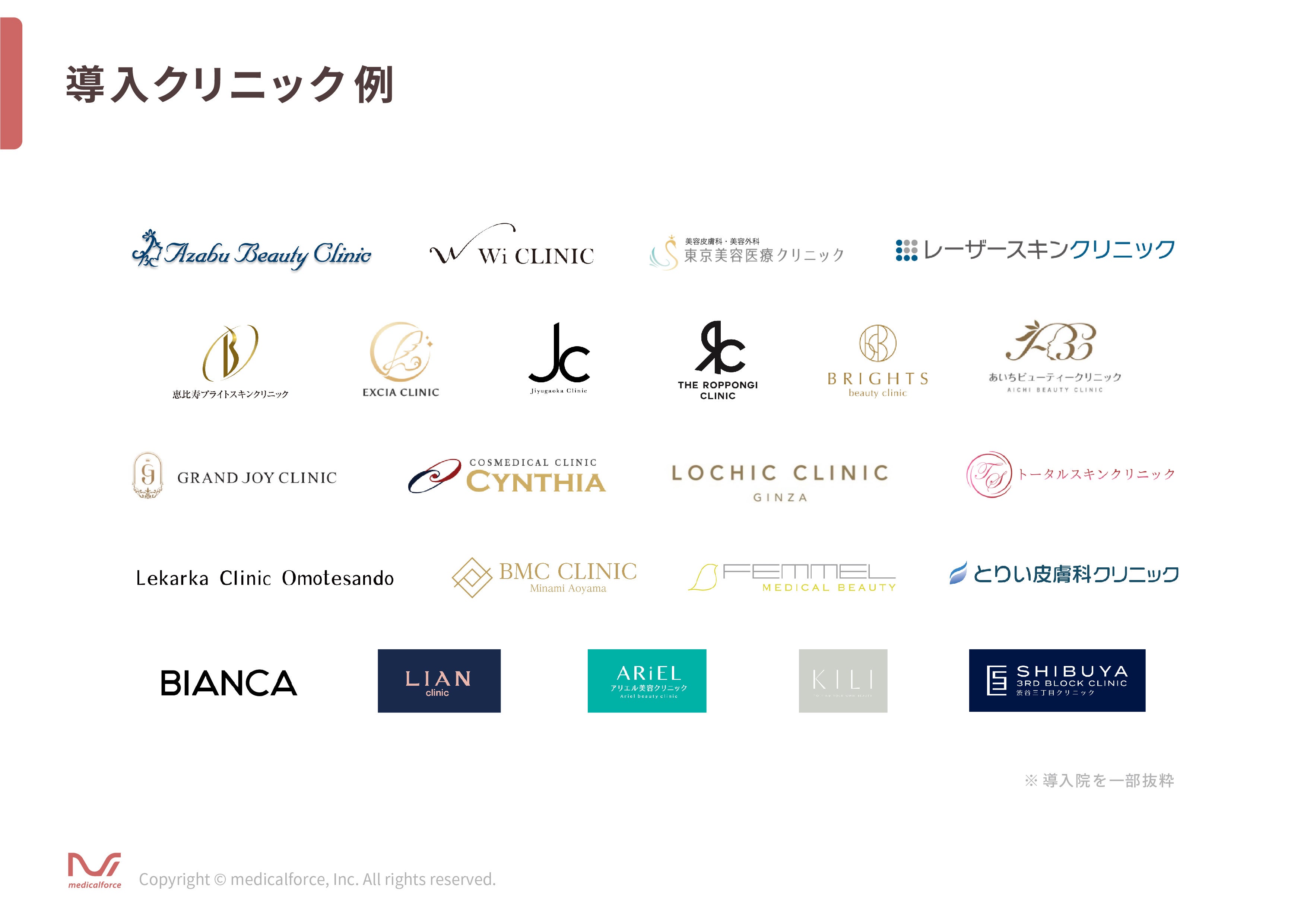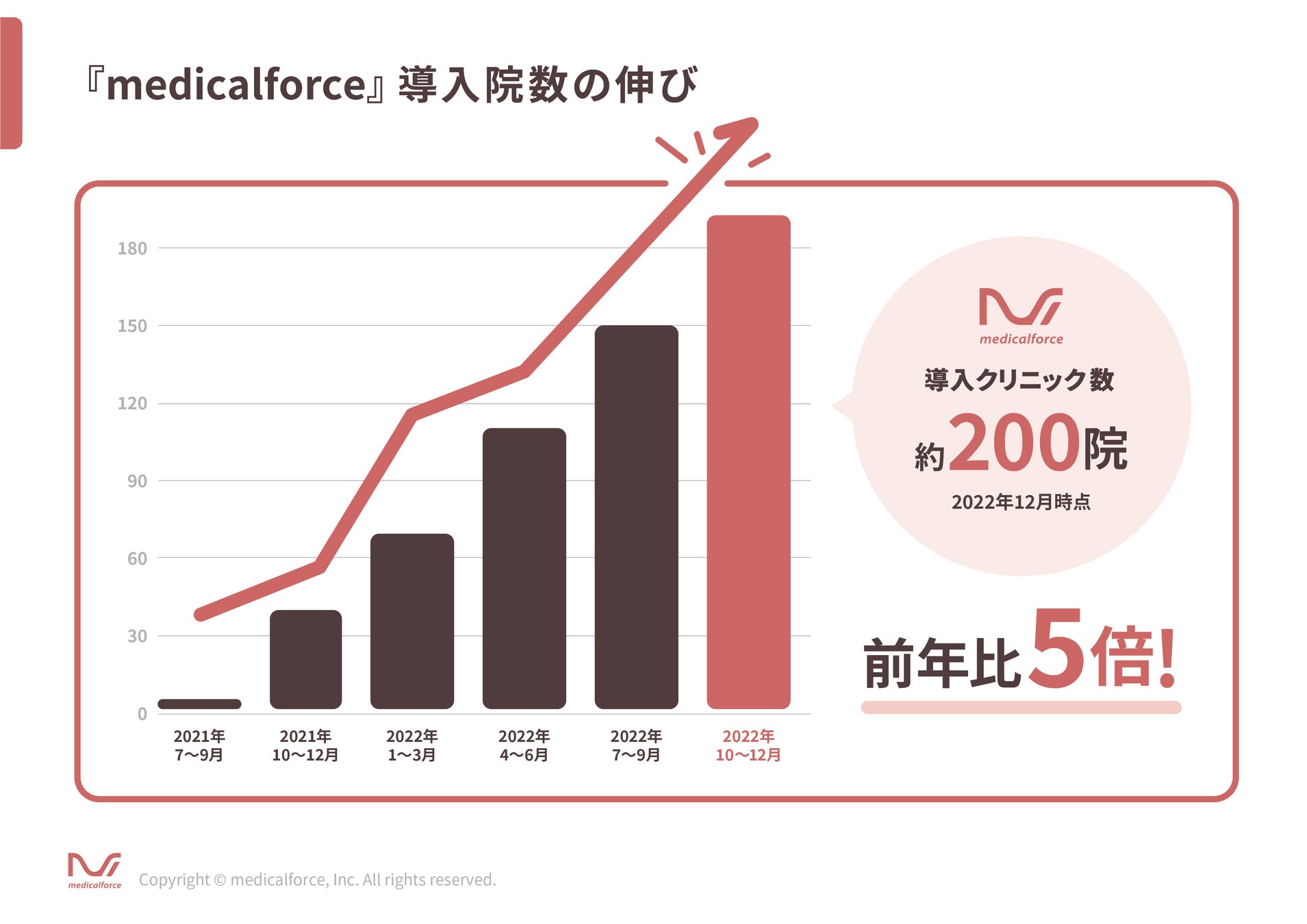 美容クリニック向けのオールインワンSaaS『medicalforce』を提供する株式会社メディカルフォース(所在地:東京都渋谷区、代表取締役社長:大嶋 翼)は、2021年3月のサービス開始から1年9か月で導入院数が200院を突破し、前年比5倍の導入数となりました。