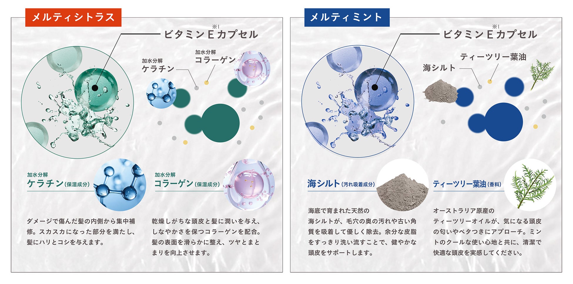 乾燥やダメージでパサつく髪へ。本製品最大の特徴は、スクラブの中に配合された「ビタミンEカプセル」です。ビタミンEを凝縮したカプセルが頭皮で弾け、芯から輝くようなツヤと、サラサラな指通りを実感いただけます。