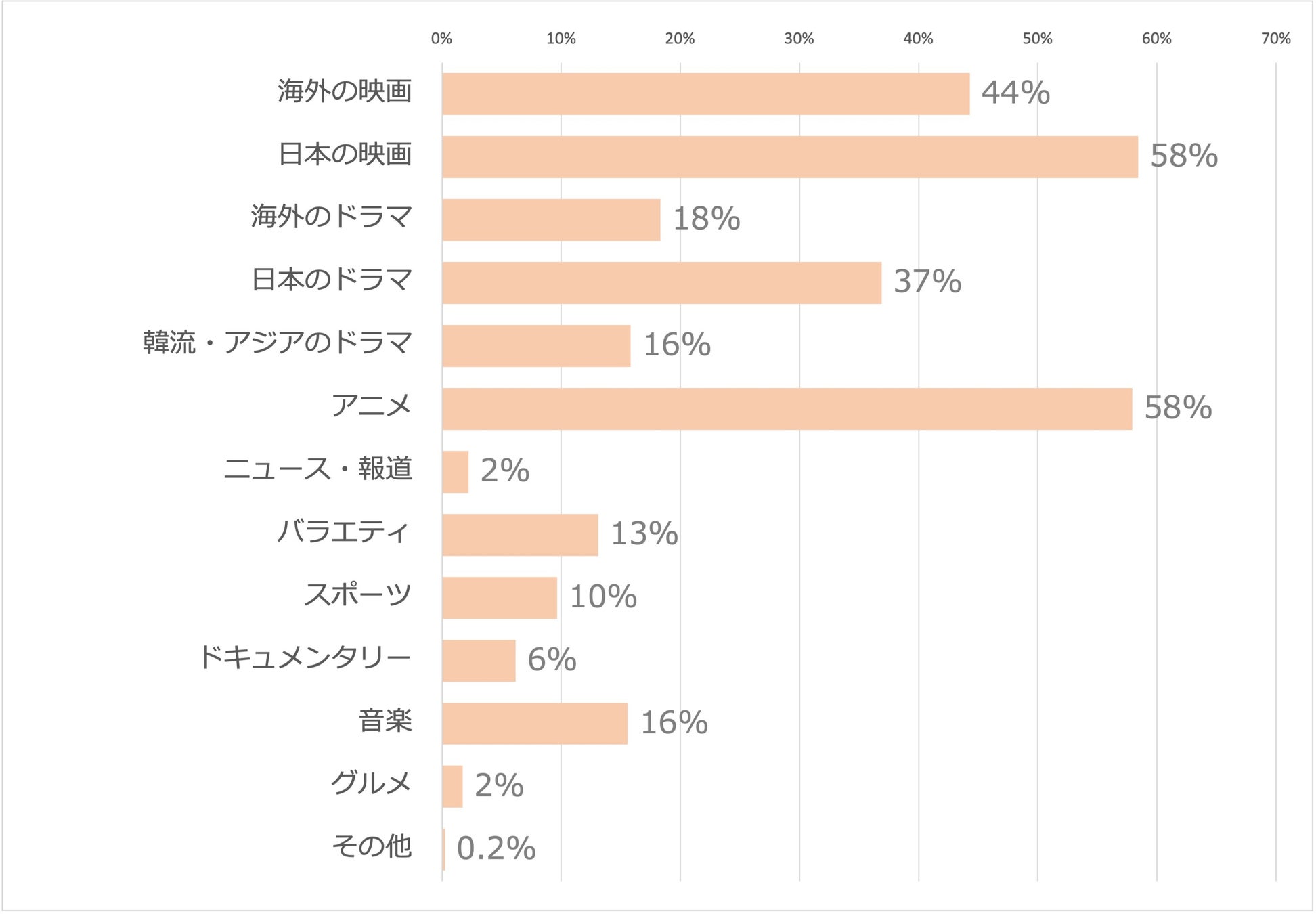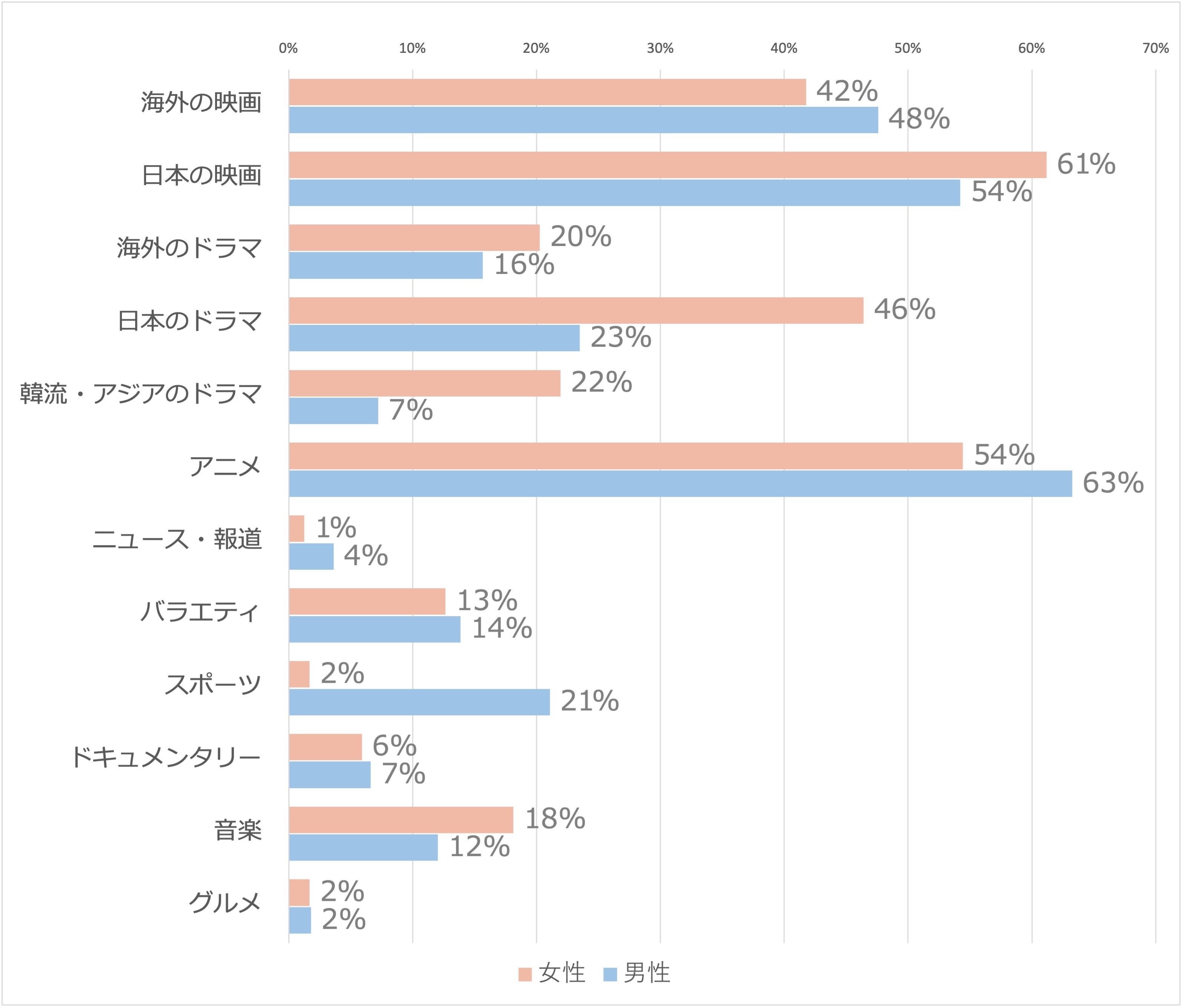 女性の場合は「日本の映画」や「日本のドラマ」の人気が高く、男性の場合は「アニメ」や「スポーツ」などが女性よりも高い数値となった。