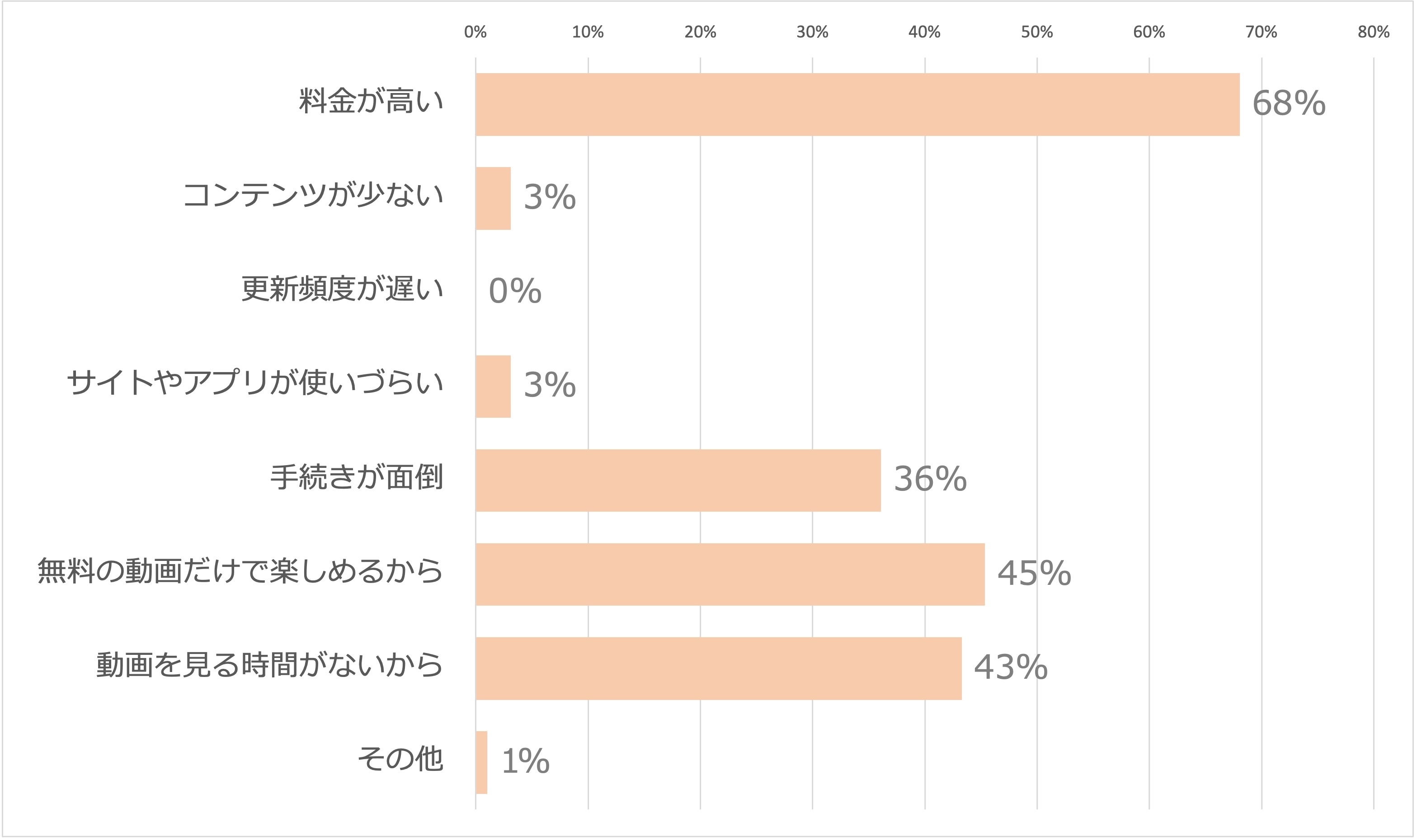 結果は料金が高いという回答が最も多く、次いで無料動画だけで楽しめるからという回答が多かった。