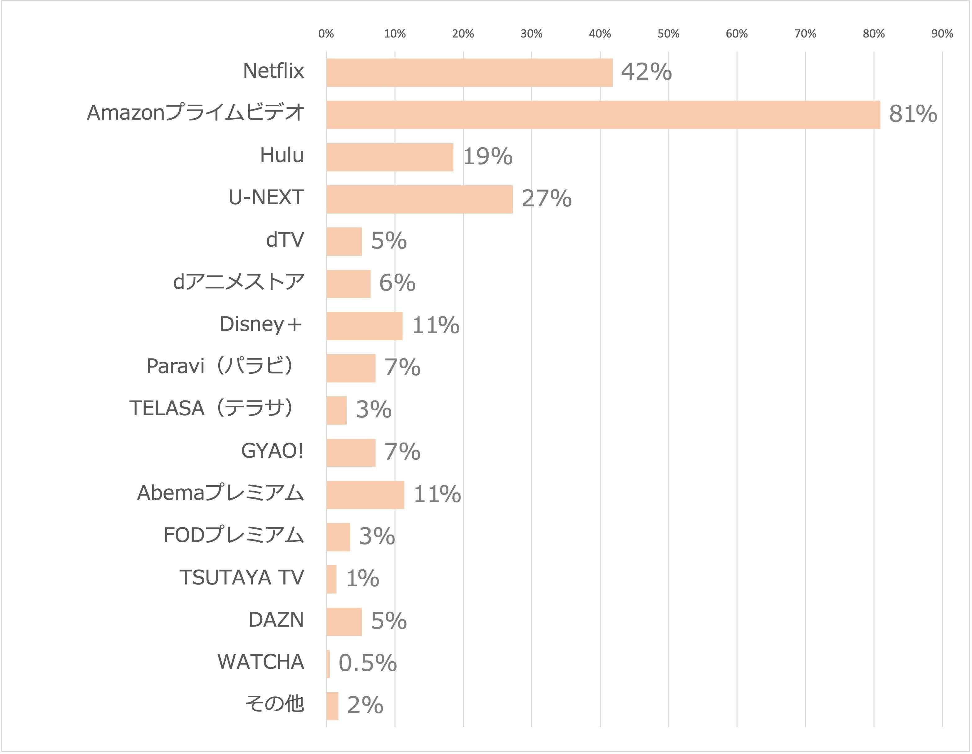 結果は、「Amazonプライムビデオ」(81%)、「Netflix」が42%、「U-NEXT」が27%、という結果になった。