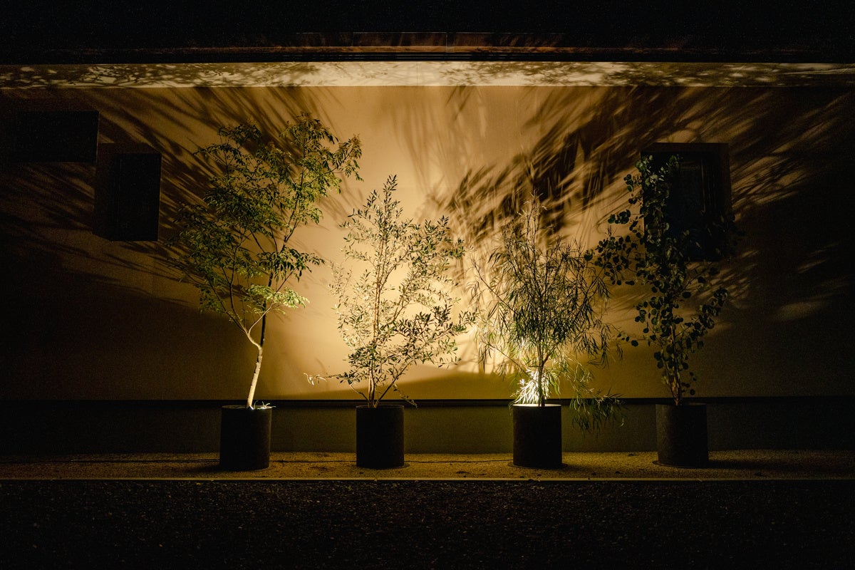 照明器具を目立たせず、植物そのものが“夜の景観”の主役になる。静かに灯る植物が、毎日の“ただいま”をあたたかく迎えてくれます。