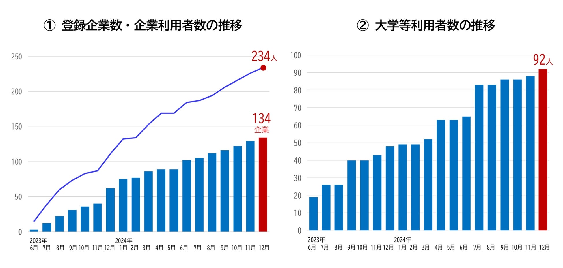 2023年6月の運用開始から2024年12月末までのOcketの「登録企業数・企業利用者数の推移」と「大学等利用者数の推移」は下図の通りです。運用開始以来、いずれも利用者は増加しています。また、これまでに企業から大学等に向けて合計22の案件が発信されており、これに対して大学等から企業に合計24の「関心あり」が通知されています。