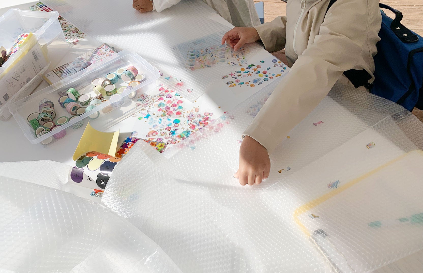 2008 年ごろから、プチプチをリサイクル原料で製造する取り組みをしており、現在リサイクル原料使用比率は平均約80%を超えています。「プチプチはリサイクルできる資源です」を合言葉に、一般生活者様のお手元に届いたプチプチに新たな価値を与えて再生するアップサイクルや、プチプチからプチプチへ資源を再利用するリサイクルができることを知ってもらう活動を行い、サステイナブル社会実現のために取り組みます。