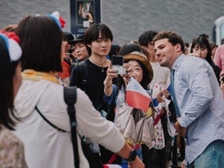 また7月14日のフランス革命記念日には、ルイ・ヴィトンのアンバサダーで同じくフランスパビリオンのアンバサダーを務めたラグビーフランス代表選手でオリンピック金メダリストのアントワーヌ・デュポン氏が特別出演。来日中には、LVMH メティエ ダールとつながりの深い京丹後の工房を訪れ、日本ならではの卓越した職人技の世界に触れました。