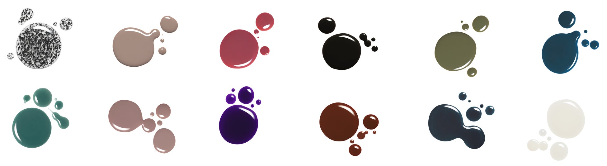 左上から、00 crunky black、01 NU-PEBBLE、02 ROZY-SYRUP、03 MONGDOL、04 MUD GREEN、05 DEEP AQUA、06 OK、07 MAUVE SAND、08 PURPLE MOOD、09 AMBER、10 DUSK NAVY、11 CLOUD MATTE