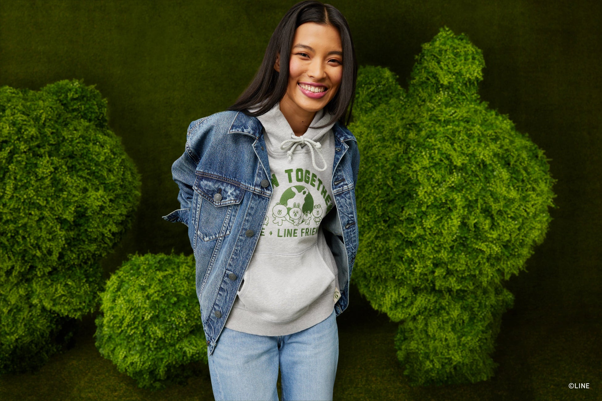 19種類のアイテムは、AEのアイコニックなデニムコレクションとのミックスマッチを想定し、LINE FRIENDSの仲間たちがTシャツ、フーディー、デニムジャケット、アクセサリーなどに登場。これらのスタイルは、持続可能な方法で生産・調達された素材を使用し、地球環境に配慮した衣類やアクセサリーを生産するグローバルな取り組み、AE のサステナブルな 「REAL GOOD」 コレクションの一部です。