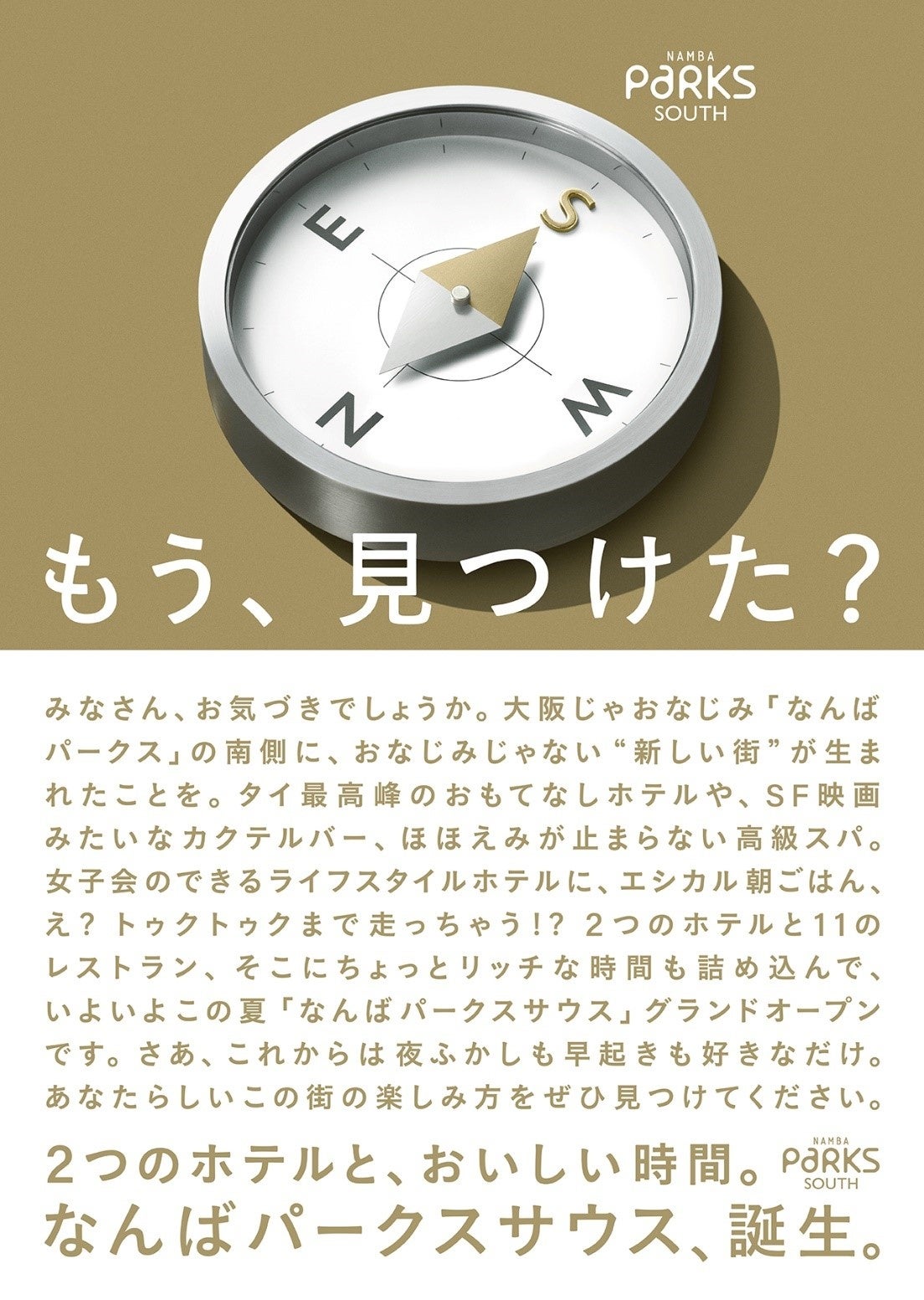 高級感のあるシックな金色、通称“サウスゴールド”を背負いながら、いつもとは真逆の方角を指す意味ありげなコンパス。そして「もう、見つけた?」と問いかけるキャッチコピーが好奇心旺盛な大人たちを未知なる街へと駆り立てます。