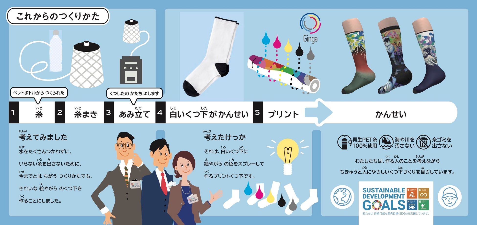 レンフロ・ジャパン株式会社が開発したGINGAは、従来の糸を染めた後編み立て、余分な糸をカットする製法における、染めた糸を洗う工程で河川を汚染すること、カットした糸の廃棄においてCO2を排出することの2点を廃した、環境に優しい靴下専用インクジェットプリント機。GINGAには環境に優しい他、非常に短い納期で極小ロットで生産可能という点でも従来と比較してメリットがあり、今後靴下製造の主流となり得る製法と言われています。