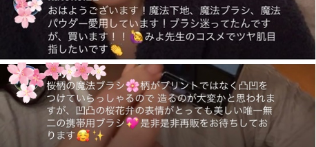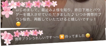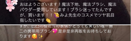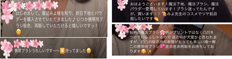弊社代表、メイク講師であり美容科である福井美余が、長年満席になっていた美容講座が、コロナ禍で全てキャンセルになった瞬間から始めたのがFacebook・インスタ・YouTubeライブでした。そのライブ中にお客様の生の声をライブ中のコメント拾い上げ、それを福井のもつプロの技術と知識で商品化し、ライブを通してお客様と一緒に試しながら育て上げ、商品化しました。ライブ中の158万人を超える視聴者から「持ち歩き用のブラシ作ってください」「フェイスブラシとチークブラシが欲しいです」「リップブラシが欲しいです」というコメントから生まれた携帯用ブラシです。開発中も希望の色、カラー名称など、全てをライブ視聴者からのアンケートをもとに作り、2021年完売後もSNSを通してぜひ再販して欲しいという多数のお客様からご要望があり再販が決定いたしました。